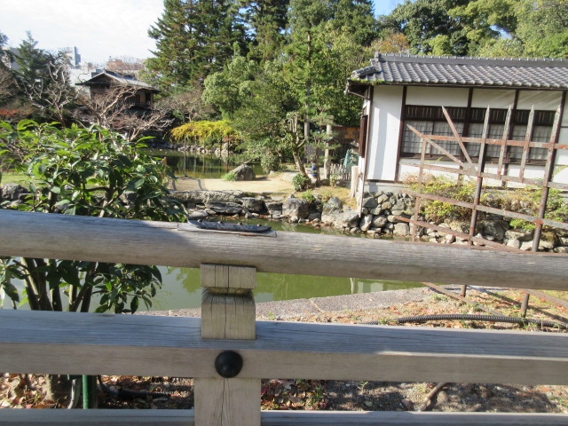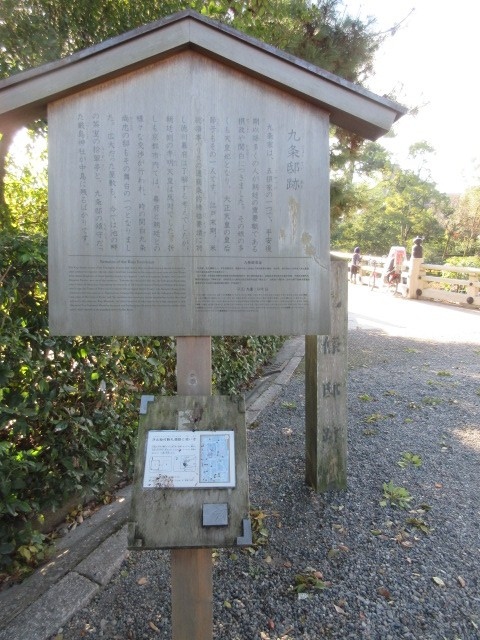 京都御苑にある昔の貴族の邸宅跡の一つです。九条家は藤原氏の一族で五摂関のひとつ、天皇と結びつきもとても強い公家だそうです。現在は案内板とともに庭園が残っていて、橋や池もありとてもきれいです。邸宅自体の建物は残念ながら残っていないですが、神社や茶室は残っています。