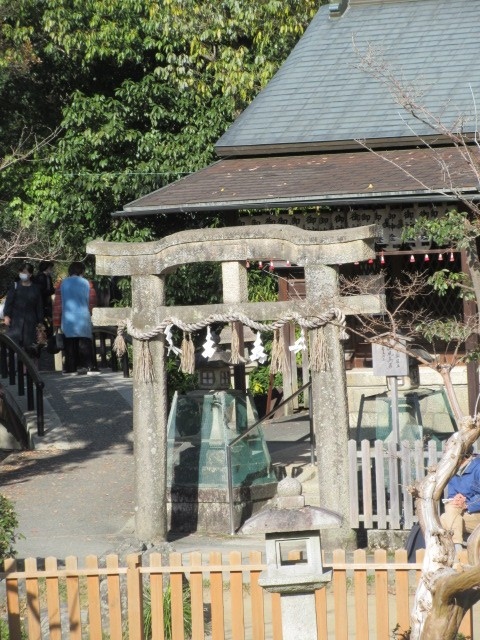 京都御苑にある九条邸の跡地に残っている九条庭園のところに建っています。九条池に面していて素敵な場所です。境内は大きくはないのですが、石の珍しい形の鳥居が立っています。京都の三大珍鳥居だそうで、破風のような形になっているので見逃さないように。