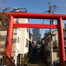 佃島の中に立つ、赤い鳥居。その先に住吉神社があります。平日に訪れたため、観光の方はいませんでしたが、通りかかった地元の方がお参りをしていく、静かな境内でした。鳥居を出て、少し左手にの方に行くと、御神輿の収納されているところがあり、外からも見ることができます。