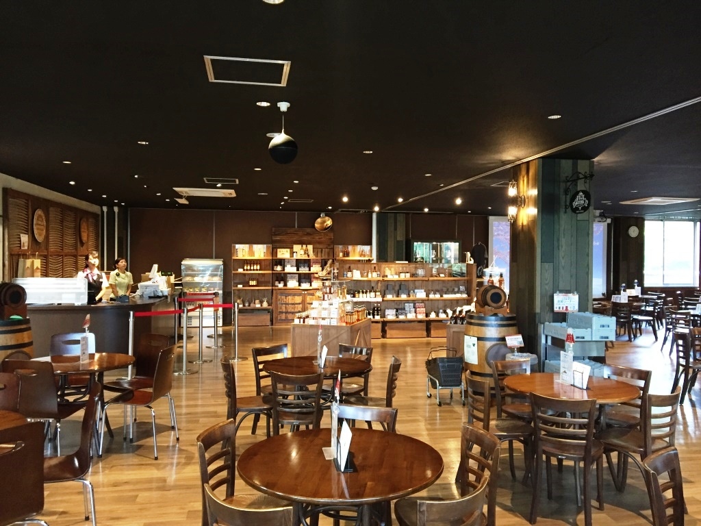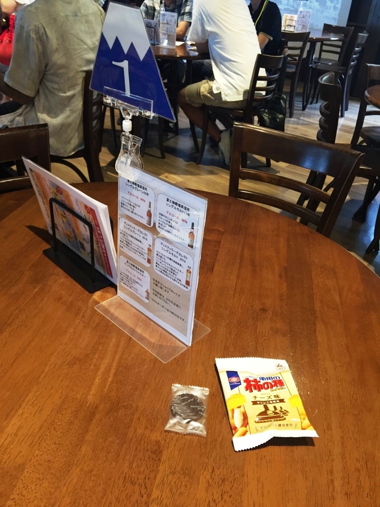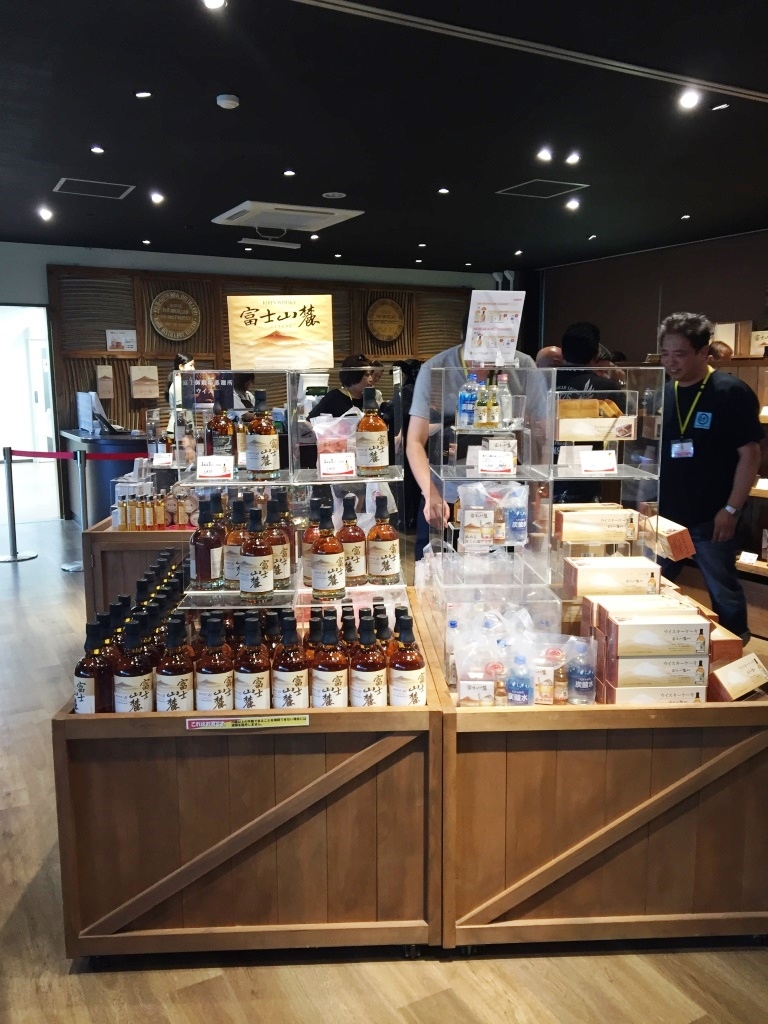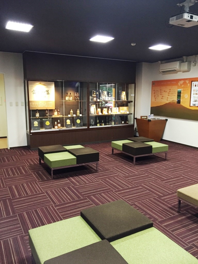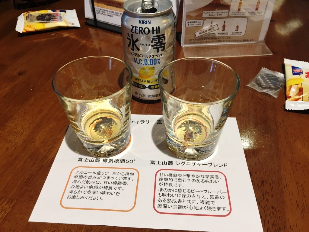 キリンウイスキー富士山麓を醸造している蒸留所です。2人であれば、体験ツアー(無料)は予約無しで大丈夫でした。この部屋で少し待って、見学&試飲ツアーのスタート。十数人のグループに、説明員が付いて案内してくれました。最後はもちろん試飲タイム、舐める程度の両ですが、富士山麓シグニチャーブレンドと樽熟原酒50度、柿の種のチーズ味のおつまみ付きで賞味できました。ウィスキー好きには外せないスポットです。