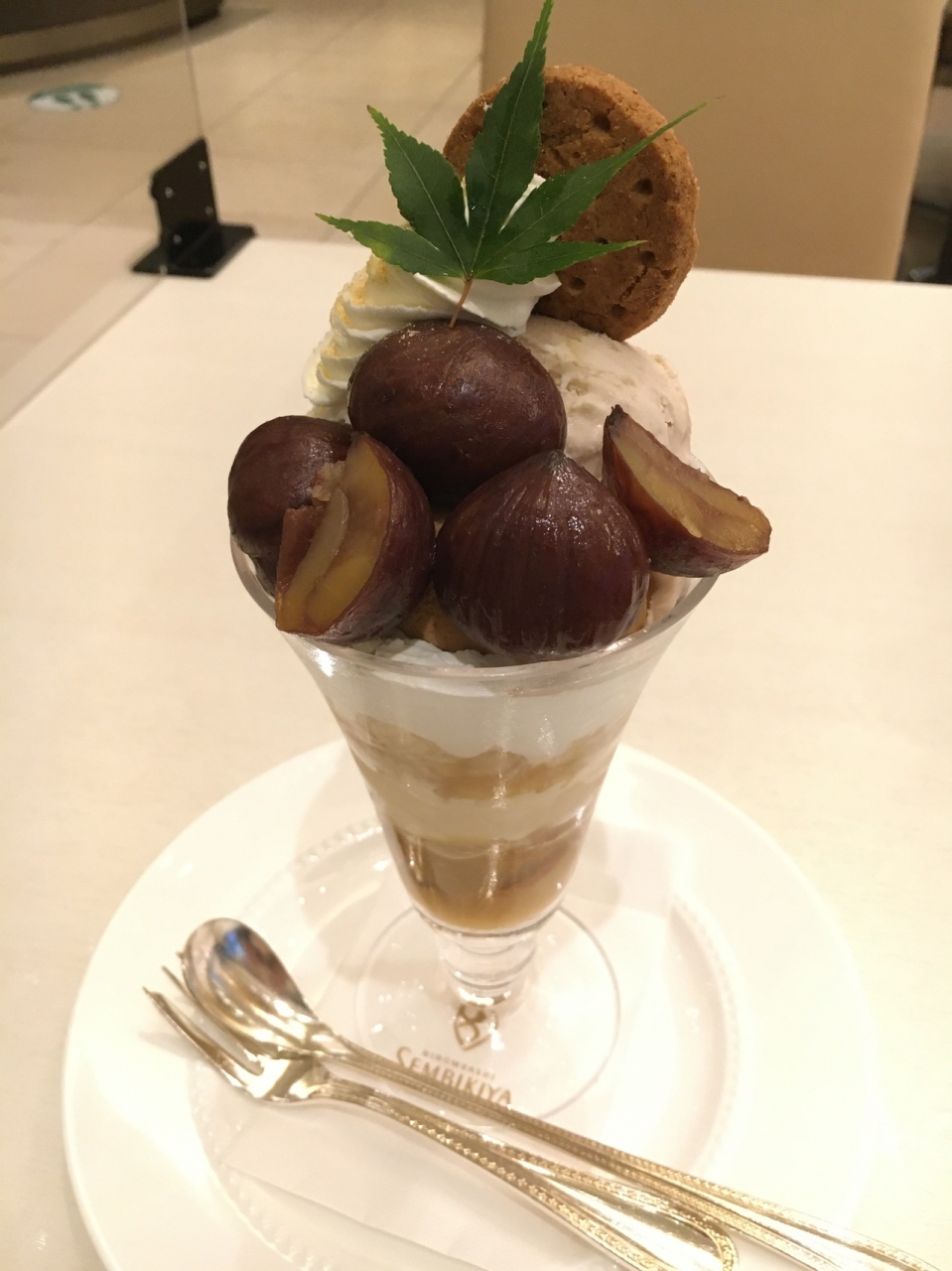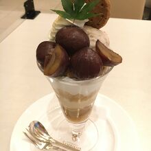 高級感ある店内で国産和栗の渋皮煮パルフェ2980円をいただきました。トップは綺麗に盛り付けられた大ぶりな栗と紅葉の葉、ビスケット、生クリーム。3種類のアイスクリーム(栗、キャラメル、バニラ)にマカダミアナッツの食感が楽しいです。気軽に食べられる値段ではありませんが、大変おいしく、来年の秋も食べたいと思う一品でした。