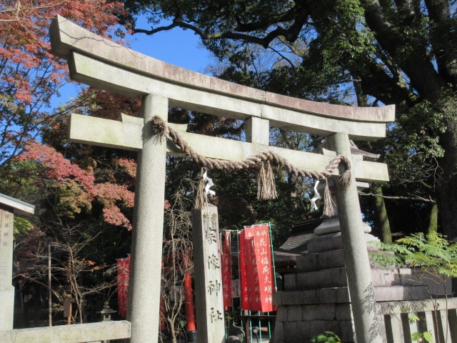 京都御苑の敷地内にある神社の一つです。場所は京都御苑の西南にあたる場所なので、裏鬼門を守る重要な神社です。石の鳥居を抜けると本殿があり、檜皮葺で立派な屋根でした。境内は広すぎないので参拝しやすいです。紅葉した木々とはためく旗の色合いがきれいでした。