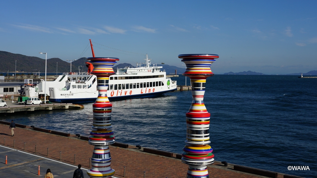 ホテルから朝の散歩で高松港の離島航路桟橋を見渡せる歩行者デッキで、船体にオリーブラインと大きく書かれた小豆島行きのフェリーがドリフトしながら上手に接岸する様を見ていたら自分たちも船に乗りたくなりました。
