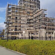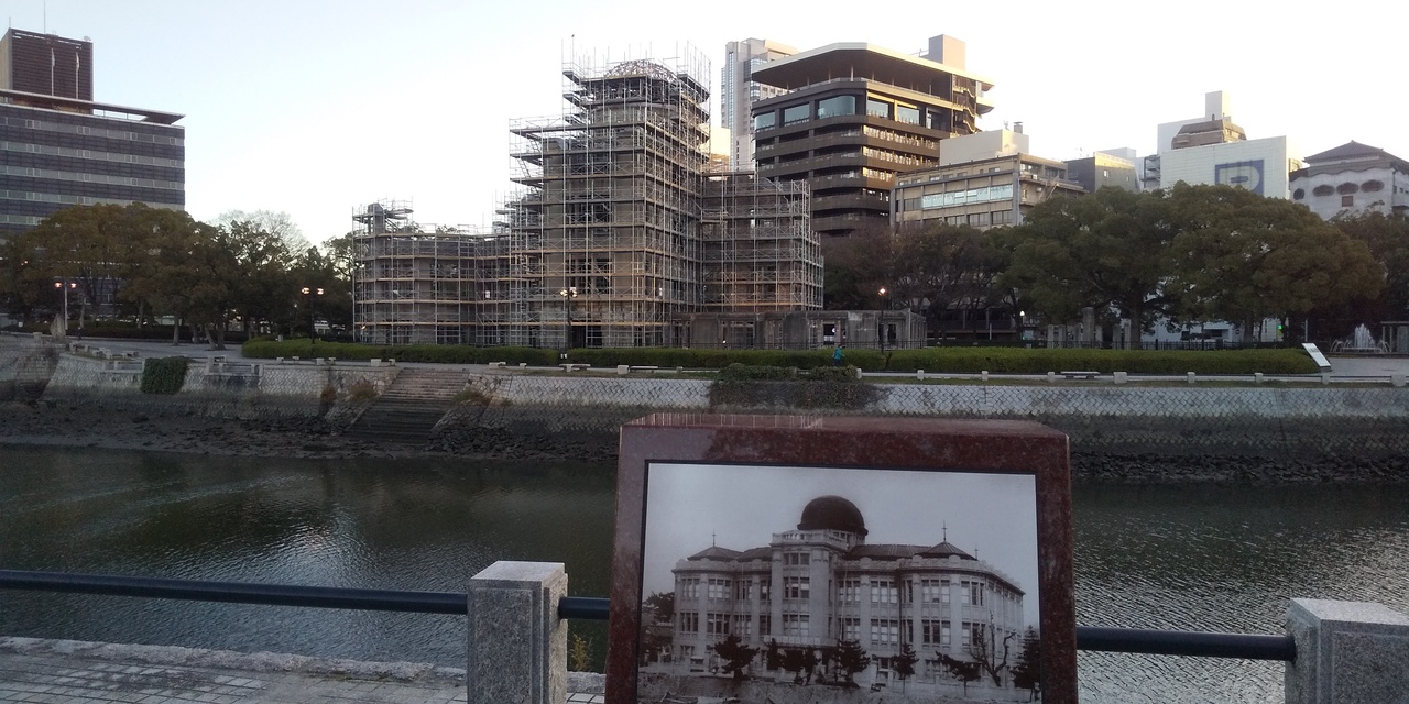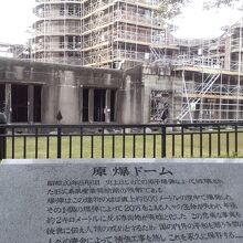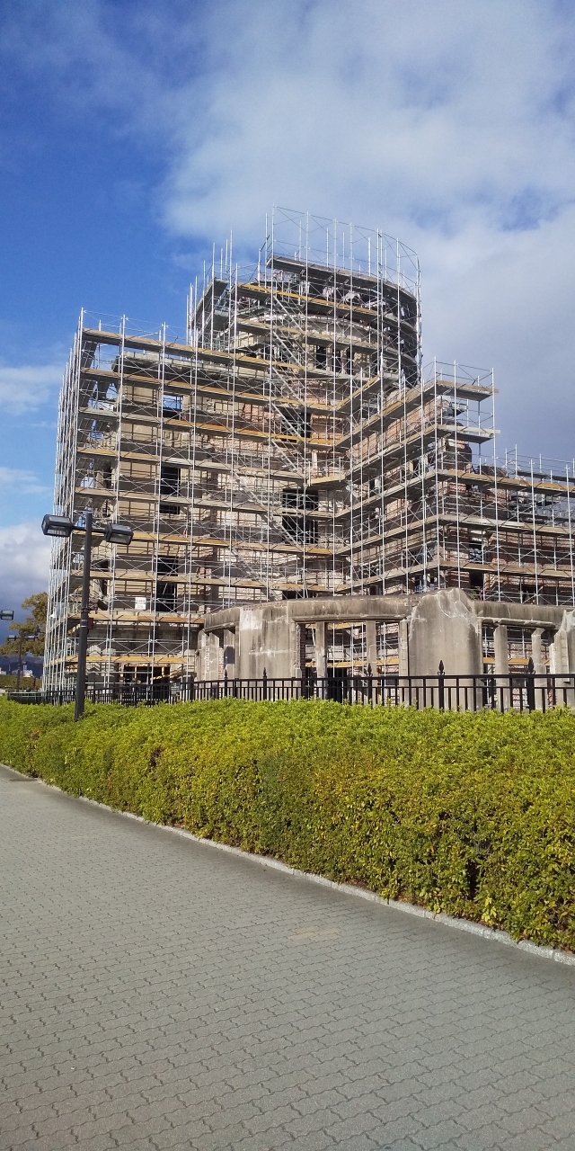 原爆ドームは、保存のための工事を行われています。工期は、今年の秋から来年春にかけてで、全体に足場が組まれています。