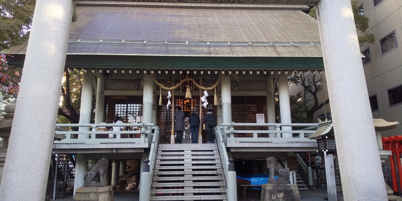 広島市内の中心部、平和大通りのホテルやビル群の中にひっそりと鎮座する神社です。