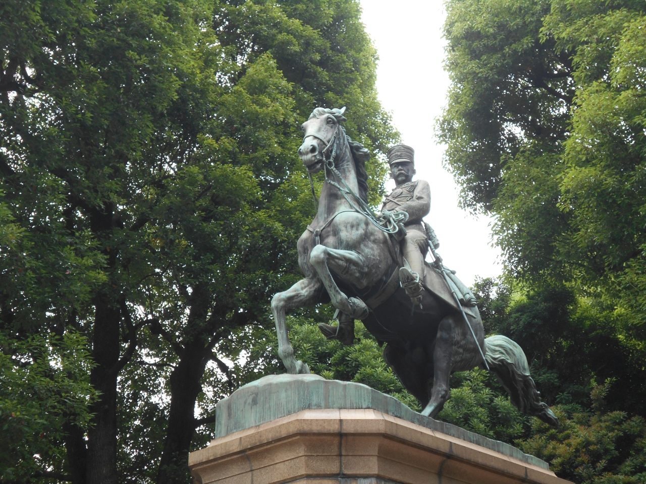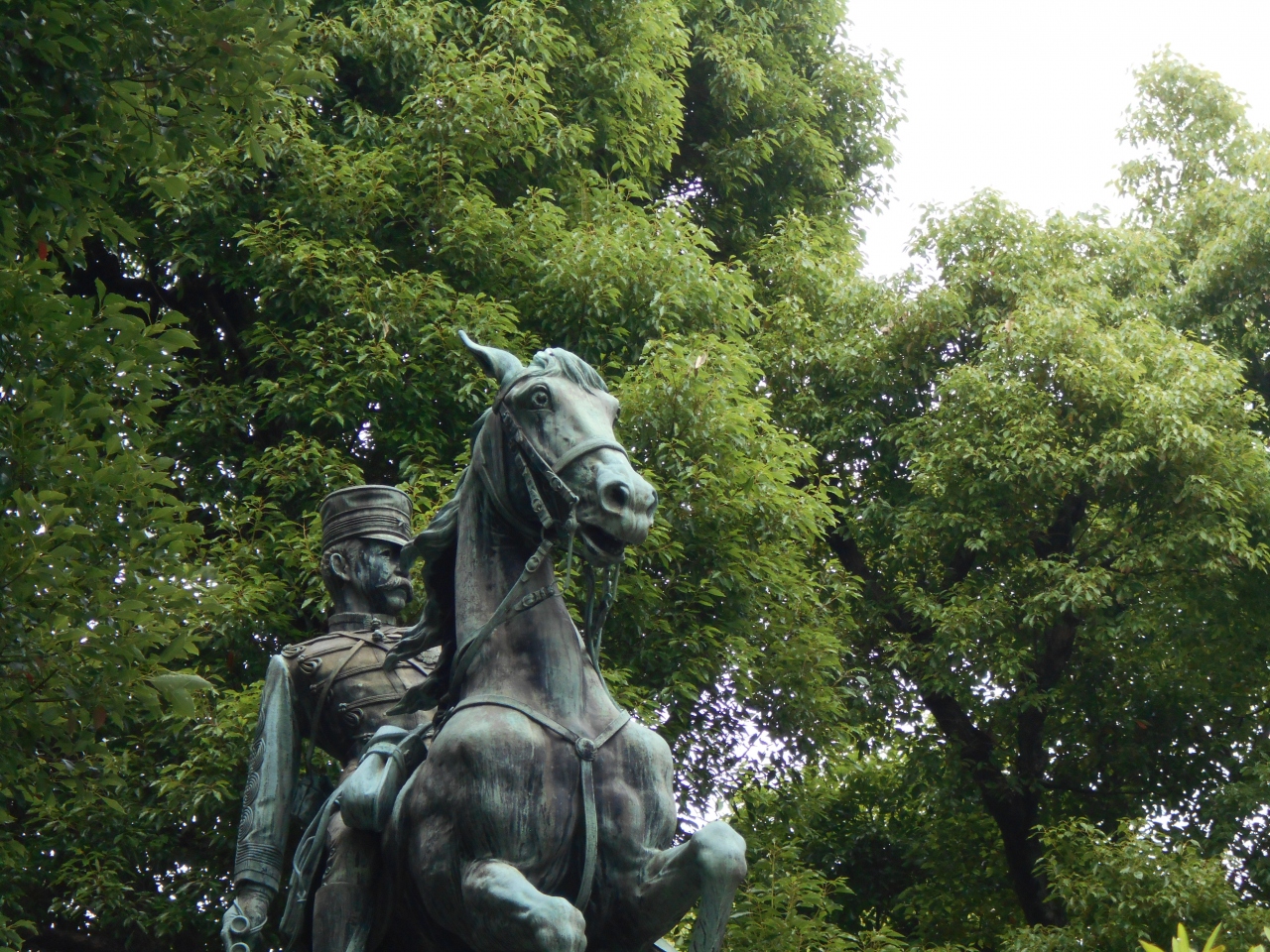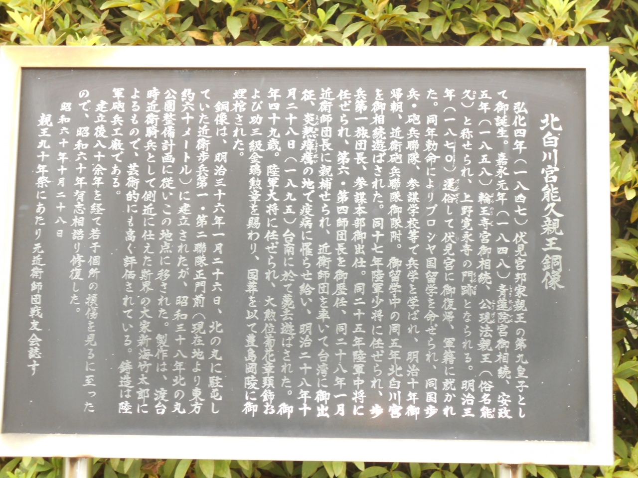 国立近代美術館工芸館近くの木々に囲まれた地に銅像が立てられています。近衛師団の師団長を務めた皇族軍人です。銅像は軍服姿で馬に跨る勇猛果敢な姿です。幼くして都を離れ、江戸の地で僧侶として過ごし、一時は奥羽越列藩同盟の盟主として朝敵なり、その後ドイツの陸軍大学に留学しました。陸軍軍人として台湾平定の英雄とされ、異国の地で不運の死をとげられました。