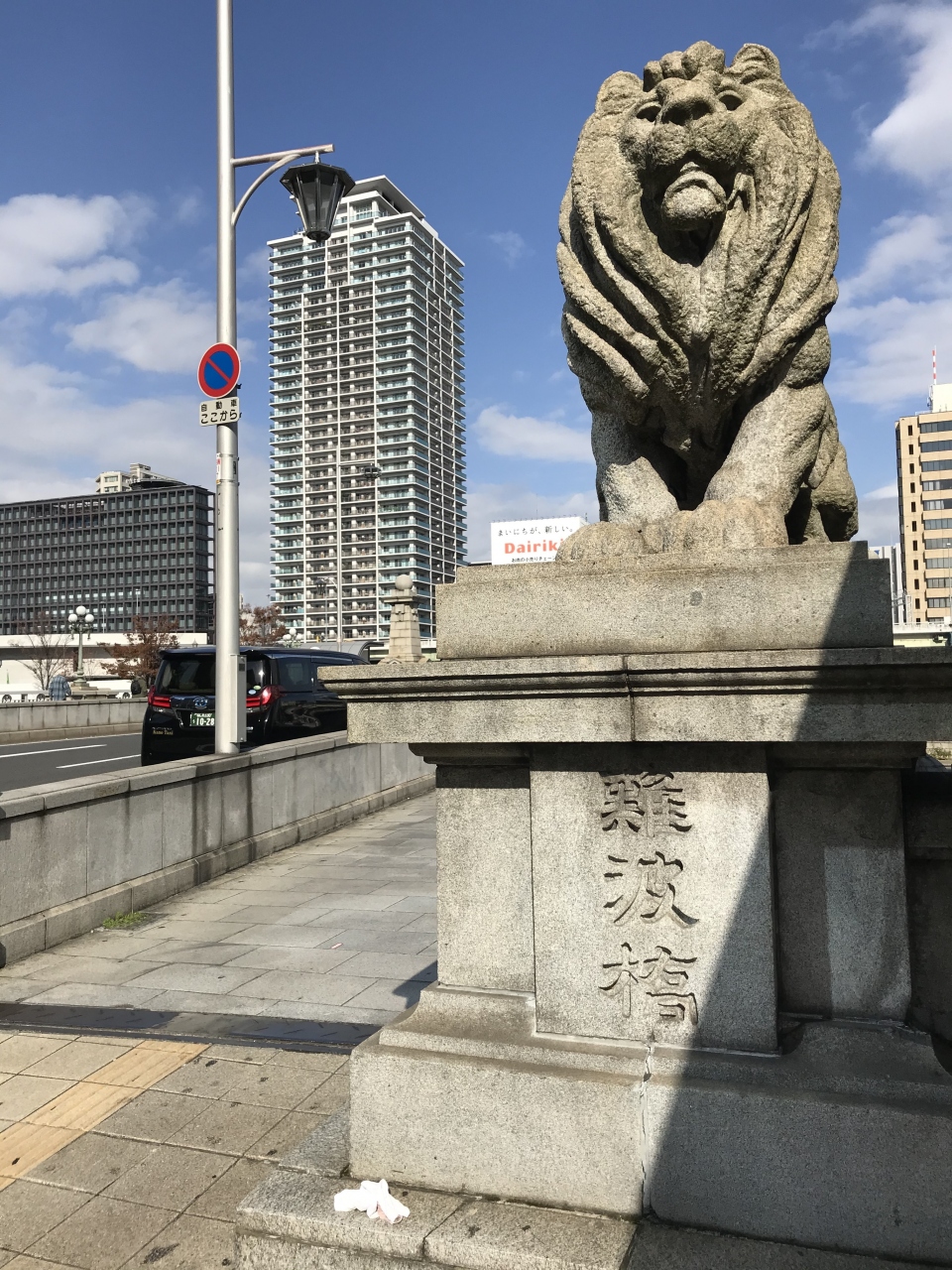ライオン橋とも呼ばれる「難波橋」は全長約190メートルで、土佐堀川と堂島川の2つの川を渡る格好の橋で1915年に建設され、1975年に大改修が」行われています。橋の南詰と北詰にはインパクトの強い獅子像が飾られています。
