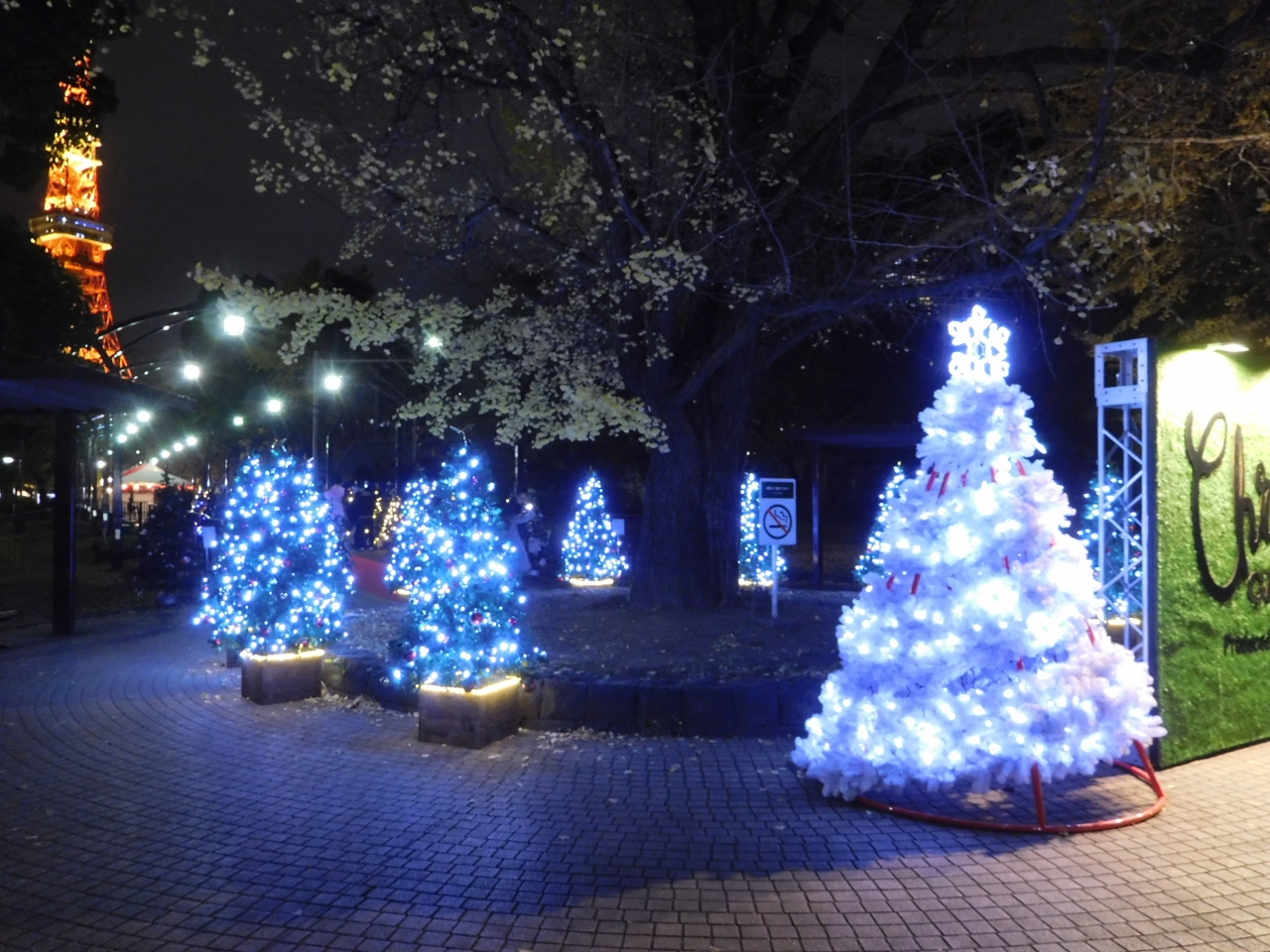 地下鉄「御成門」の駅を出てすぐの場所にある「芝公園」です。ちょうど東京タワーが見える公園の入口に「クリスマスガーデン」と書かれたフォトスポットが設置され、クリスマスツリーの並ぶ通りを進んで行くと、奥の方には、ショップや飲食のお店が立ち並んでいました。日本最大級のクリスマスイベントのようで、東京タワーを眺めながら、思いがけずX'masのイベントを楽しむ事が出来て良かったです。