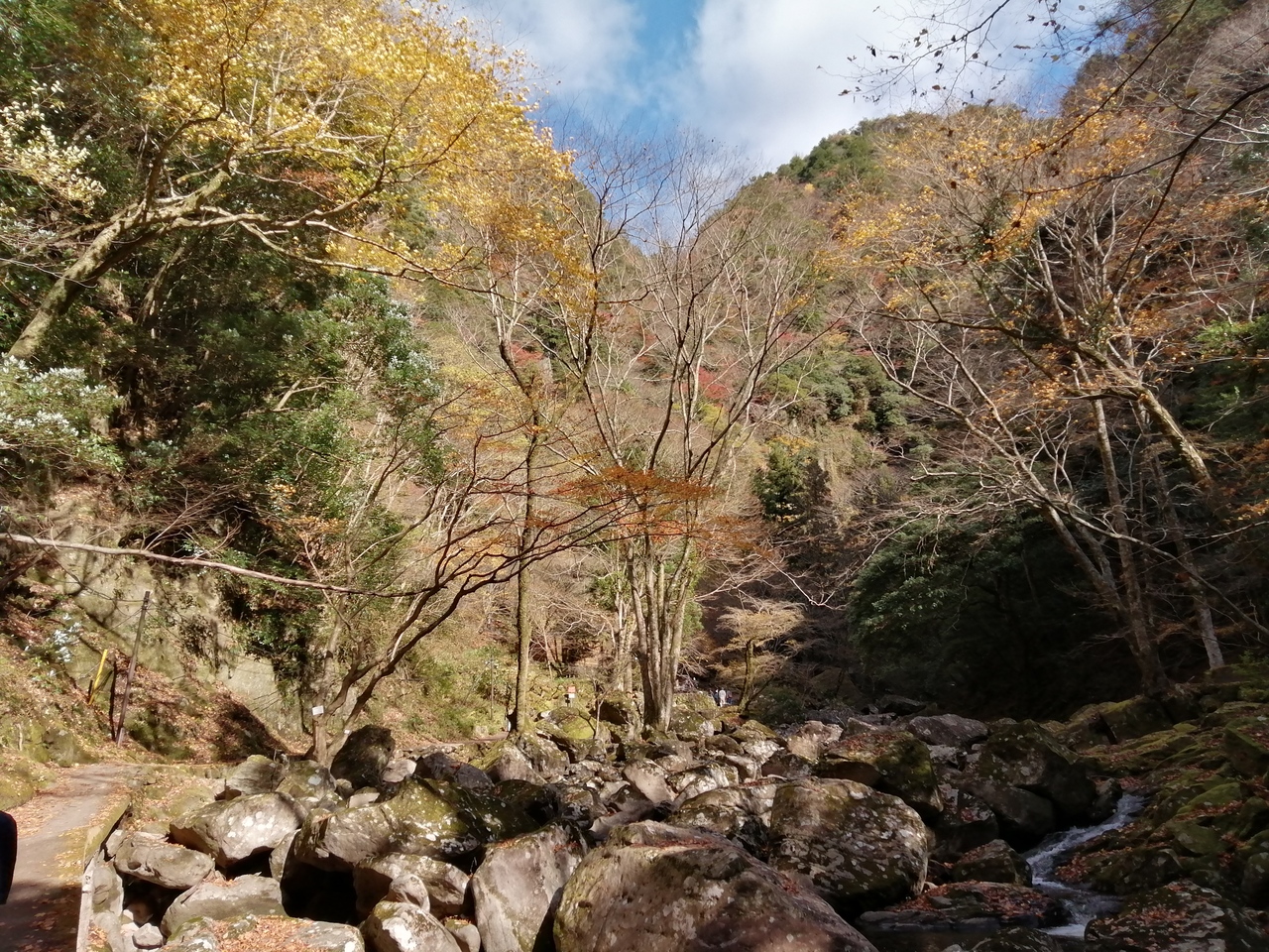 紅葉見学を兼ねて訪れましたが11/21では少し遅かったようです(年によると思いますが…)。入場料は大人500円、子供250円。一般的な散策コースとなっているのは岩窟滝までの約3.5kmで行き約1時間30分、帰りは約1時間15分かかりました。48の滝があるわけではなく、実際は大小25ほどです。基本なだらかな登りですがスポット的に急な登り下りがあります。気を許すと川底に滑り落ちる危険な箇所もあります。
