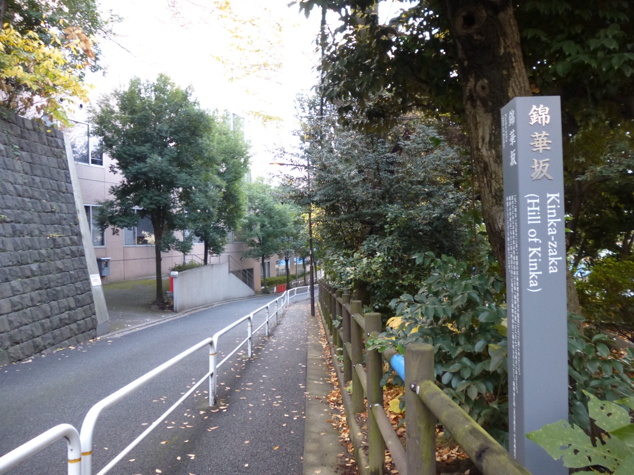 「錦華坂」の名前の由来は、かつて近くにあった「錦華小学校」ということです。今でもこの坂の近くには明治大学キャンパスをはじめ多くの学校や専門学校などが並び、私たちが足を運んだ平日の午前中も、学生らしき方々の姿が多かったです。
