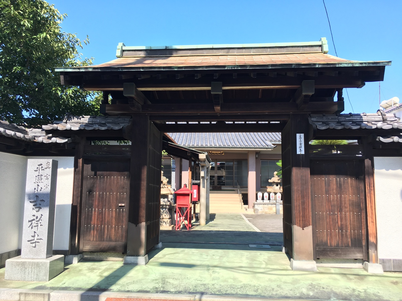 吉祥寺は、JR高松駅から徒歩10分くらいのところにある真言宗御室派の寺院です。高松駅近辺の社寺を巡った時に参拝しました。山門、本堂、歓喜天堂、庫裡などがあります。山門の近くに数体の石仏が祀られています。なぜか1体だけが後ろ向きに祀られていました。理由は不明です。