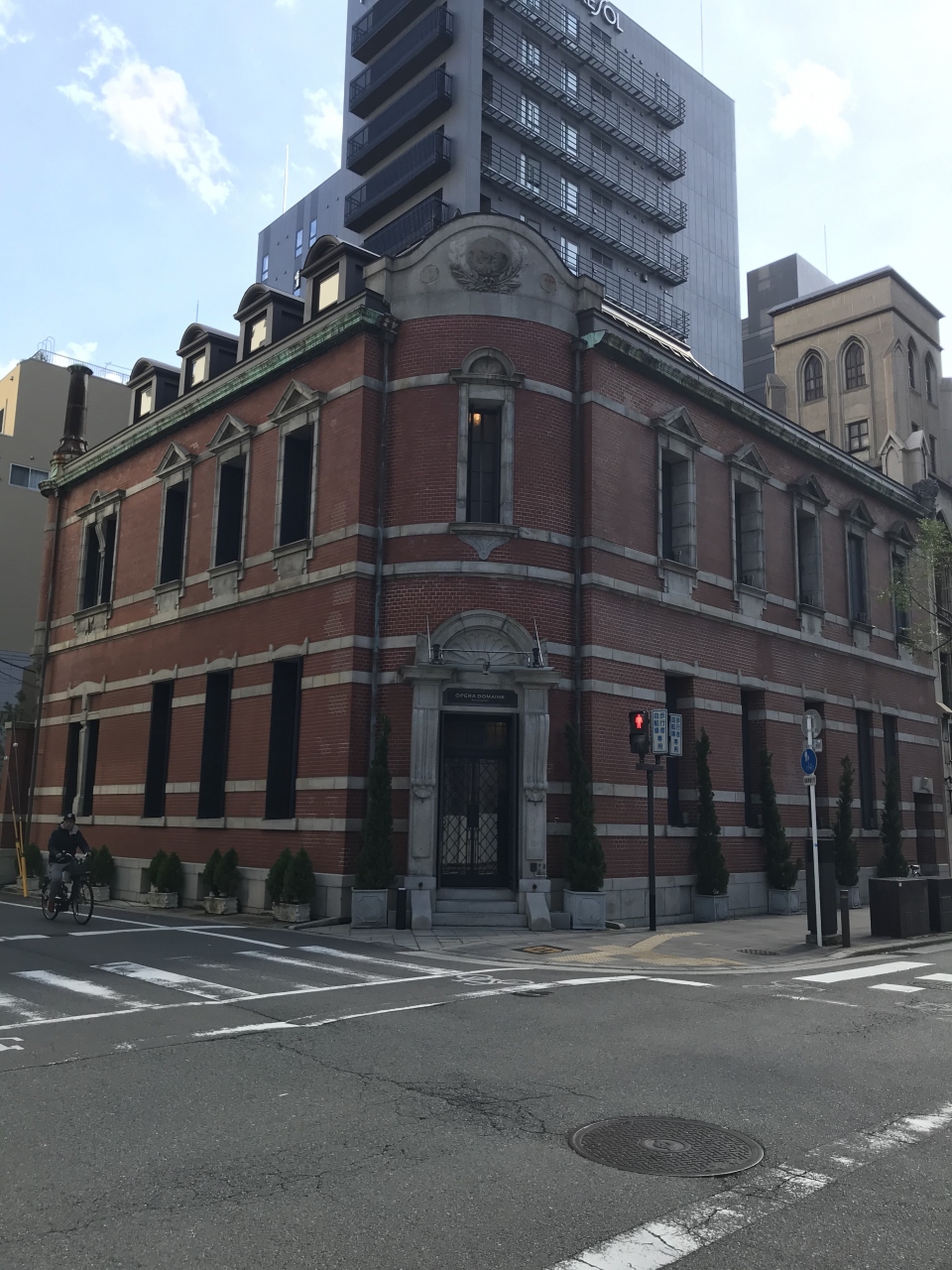 高麗橋ビルディングは、もともと1912年(明治45年)に竣工された(旧)大阪教育生命保険ビル。レンガの赤色が目を引き、明治時代後期の外観を残しています。現在では、ウェディング会場(オペラドメーヌ高麗橋)として利用されています。