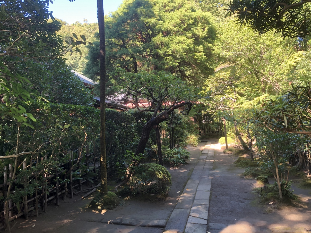円覚寺の総門をくぐり、拝観受付を過ぎると、左側に脇道があります。この入口に、「これより先 富陽庵 白雲庵 雲頂庵」と書かれた、時代を感じさせる石碑があります。この案内に従って脇道の薄暗い道を進んで行くと、最初にあるのが富陽庵。通りからは石の階段を上った先に、邸宅の門のような山門があり、富陽庵という表札が掛かっています。この門から先は、一般の見学は不可になっています。