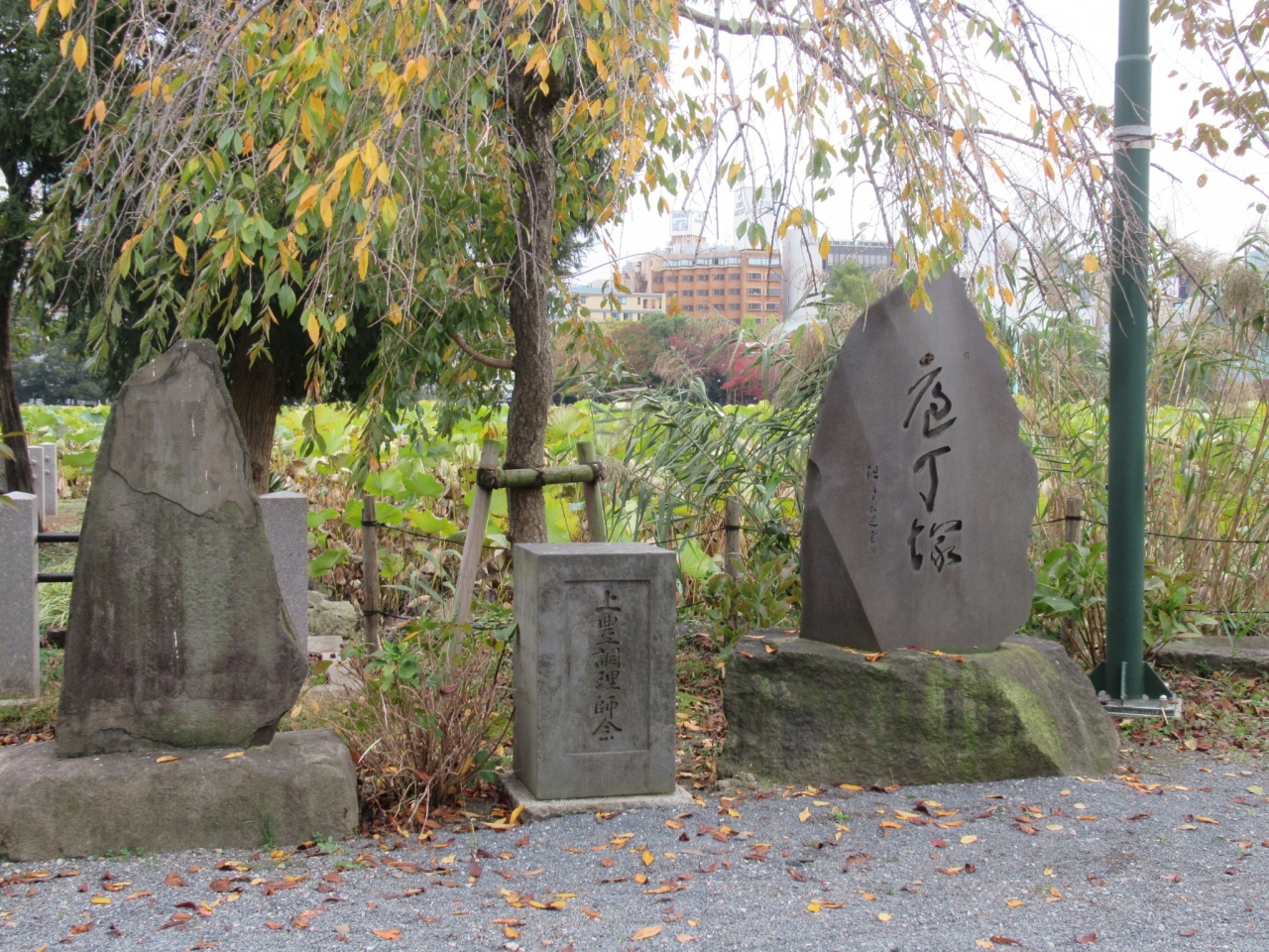 上野公園の不忍池の中央に建つ弁天堂の近くにはいろんな面白い碑が並んでいます。こちらはその中の1つ、包丁塚です。こちらは包丁の研ぎ石をイメージした形なのでしょうか。大きいのでとても目立っていました。使い古した包丁を供養しているようです。
