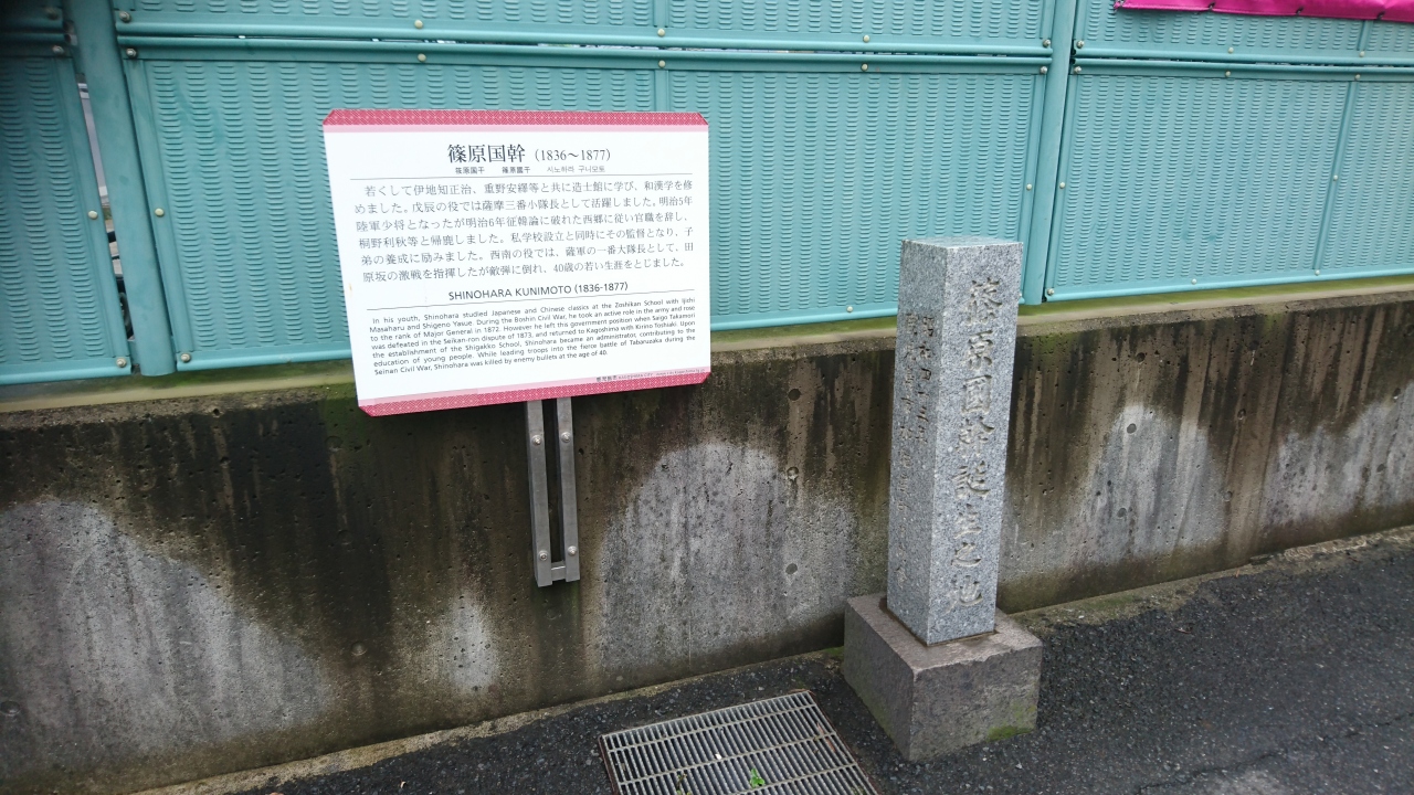 鹿児島中央高校の南側の道路沿いに複数の偉人の生誕地の石標が設置されていました。その一つが篠原国幹のものです。荒々しいイメージのある薩摩藩ですが、篠原は藩校・造士館に入って和漢学を修め、ついで藩校の句読師となりました。その一方で馬術・弓術・剣術も極めた文武両道の人だったそうです。
