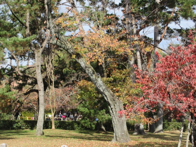 京都御苑の中にある公園です。場所は御所の北西あたりにあたって、乾門からのアクセスが便利です。ちょうど紅葉がきれいな時期で赤や黄色尾の木々に囲まれた感じでした。公園内には子供用の遊具があって、御苑内ですがふつうに子供たちが遊べるようになっていました。近衛邸跡とつながっているので桜や梅の木もあるし、池もすぐですので散策にもいいです。