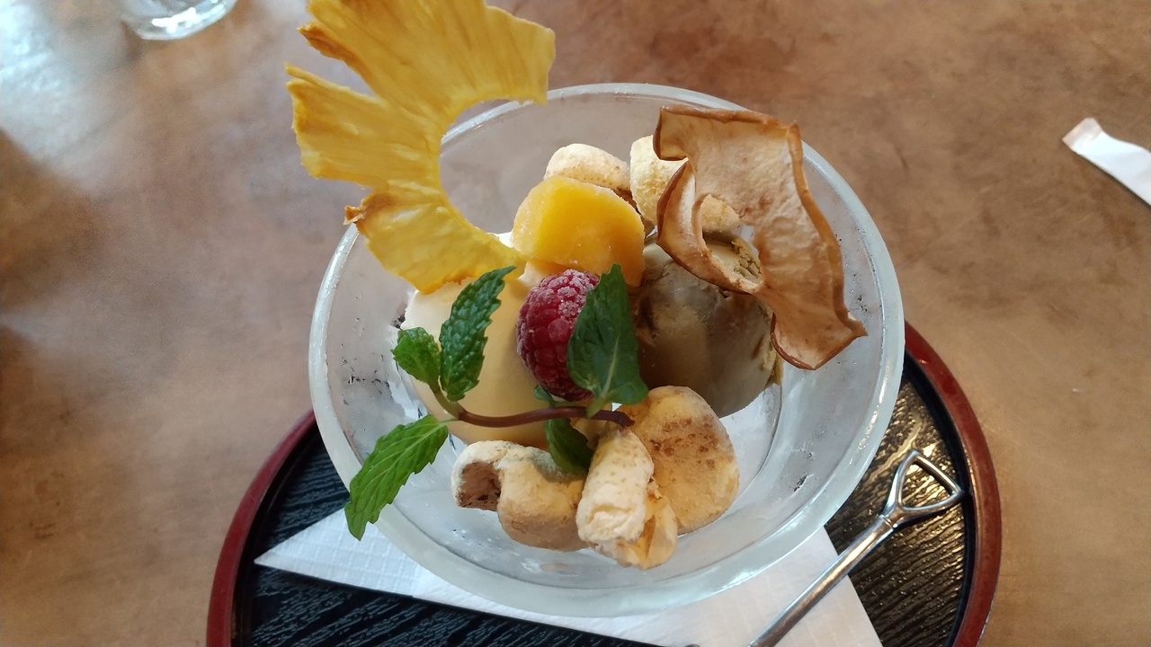 デザートのアイスクリームも毎回楽しみにしているほど美味しく、2種を選びます。以前のワッフルのカップとは変わりましたが、ドライリンゴとパイナップル、冷凍のフルーツも付いて見た目もオシャレで美味しい。