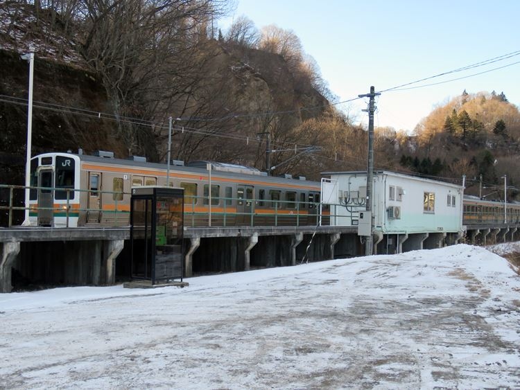 上越線から分岐して渋川から大前まで群馬県内を走る路線。JR全線乗りつぶしを目的に大前駅に降り立ちました。途中、長野原草津口など観光客が乗降しそうな駅はあるものの、万座鹿沢口~大前間は極端に運行本数が減り、折り返しを考えると終着駅まではけっこう到達が難しかった。1960年代までは県境を越えて信越線の豊野(長野県)まで延伸の計画があったらしい。その意味では大前駅は未成線の名残ということになるかもしれない。