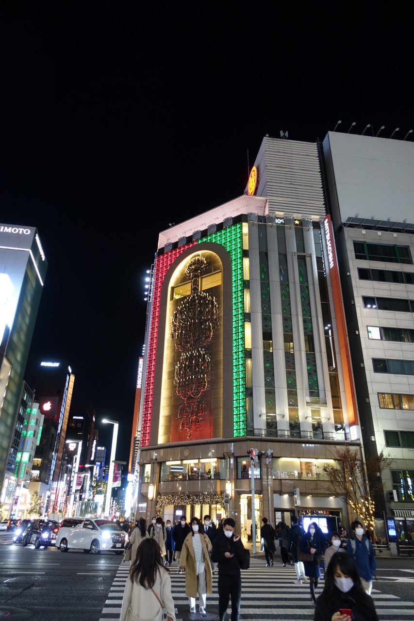 12月初旬に銀座を訪れた際、三越にも足を運びました。クリスマスを前にあちらこちらでイルミネーションや飾りつけが行われていましたが、銀座三越も壁面が美しく照らし出されていました。一時に比べるとお客さんの姿もかなり戻ったと感じました。銀座らしい賑やかな光景でした。