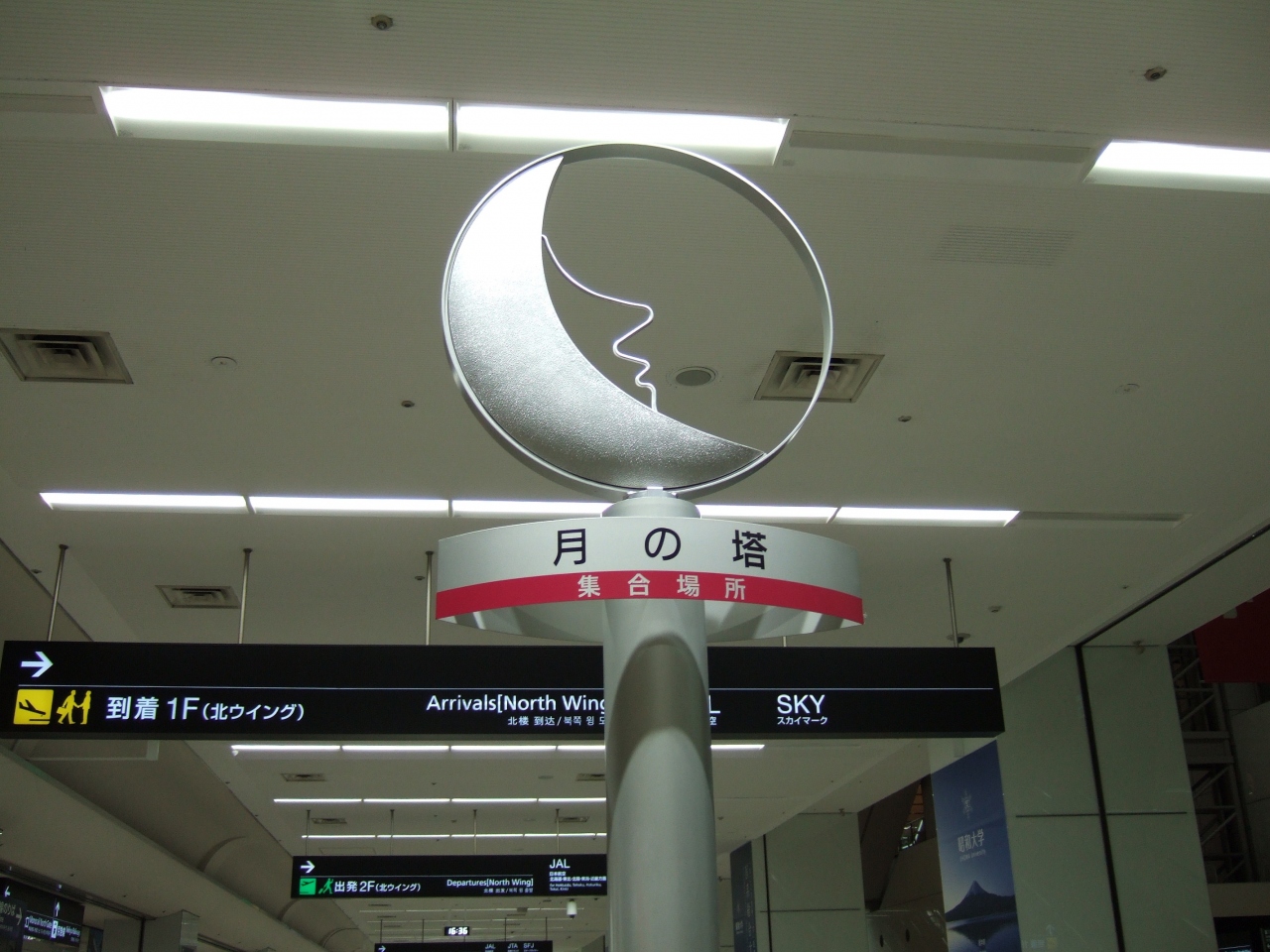 京浜急行を終点の羽田空港第1・第2ビル駅で降り、JALの第1ターミナルに向かうと右側にあるオブジェ。集合場所と書かれて、上に月をかたどったオブジェが乗っていますが、あまり目立たずにただの柱のような感じで、気を付けないと見過ごしてしまいます。