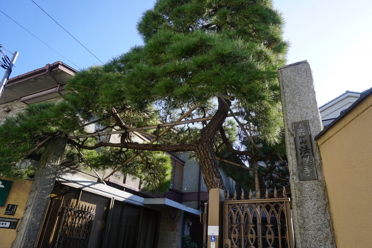 法恩寺は、法華宗の寺で、江戸時代の始め、麹町4丁目に創建。明暦年間に当地へ移転したといいます。入口、門の脇に緑の濃い松が一本立っていて、それが寺のアクセントかな。奥には都会らしいコンクリートの本堂。その奥が墓地になっています。境内は特に見どころはありません。