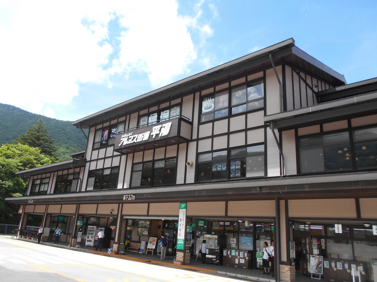 平湯の玄関口にあるドライブインで上高地・高山方面への路線バスや高速バス・特急バスの発着場となっているバスターミナルに併設されており、多くの人で賑わっています。1階が飛騨の名産品が一堂に揃うショッピングセンターと軽食やコーヒーなどのカフェ・レストランとなっています。2階は団体客向けのレストランのようです。足湯もあるのでゆっくり休憩できます。