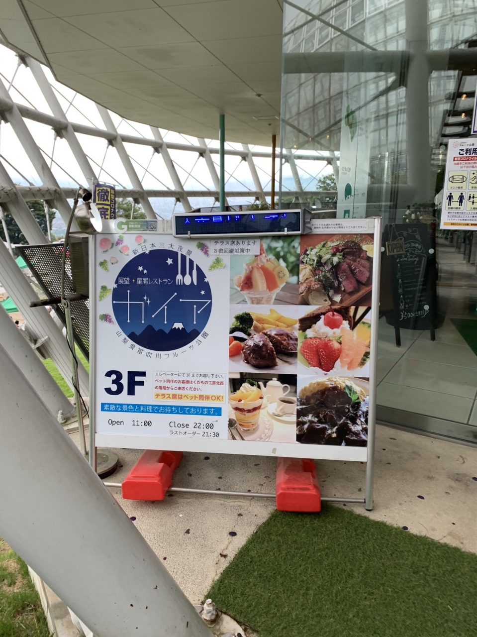 フルーツ公園内にあるレストランです。お昼に訪れると人がたくさんで、予約して1時間後に入店できました。夜は夜景をみながら食事ができるみたいです。お昼でも景色はよかったです。「富士山麓牛のローストビーフ丼」を食べました。若干火がとおりすぎかな?とおもいましたが味はよかったです。