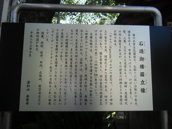説明板によると、迦楼羅は「インド神話の神鳥ガルーダ」に由来する「鳥頭人身に翼を持った異形の神」で、八部衆、あるいは千手観音の眷属である二十八部衆の一員です。
