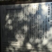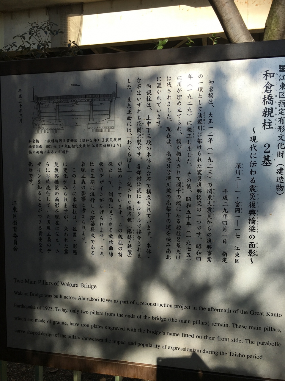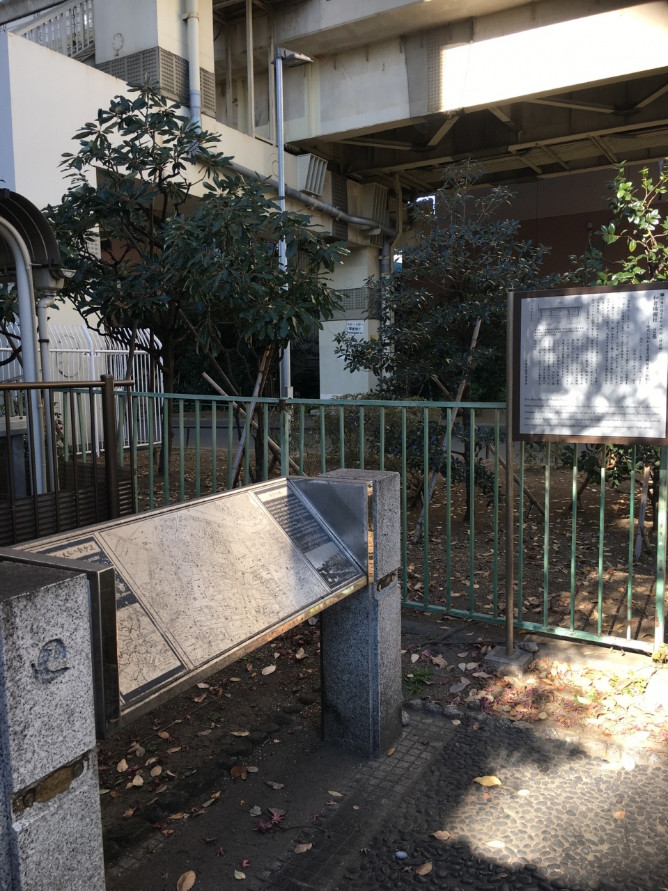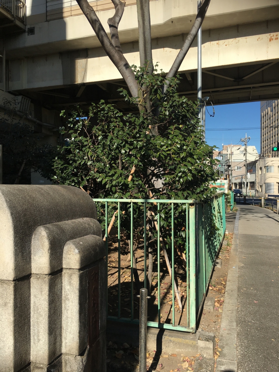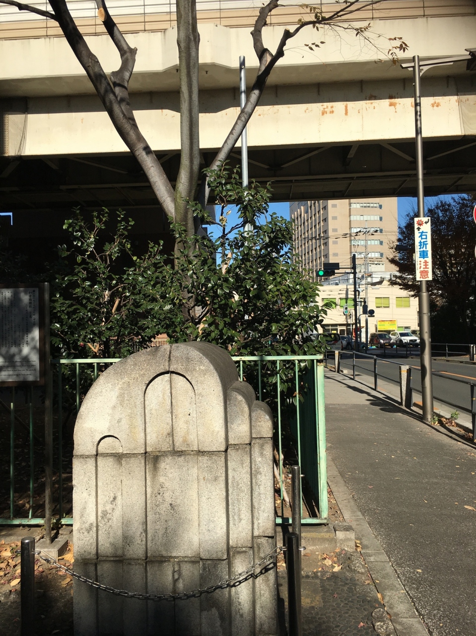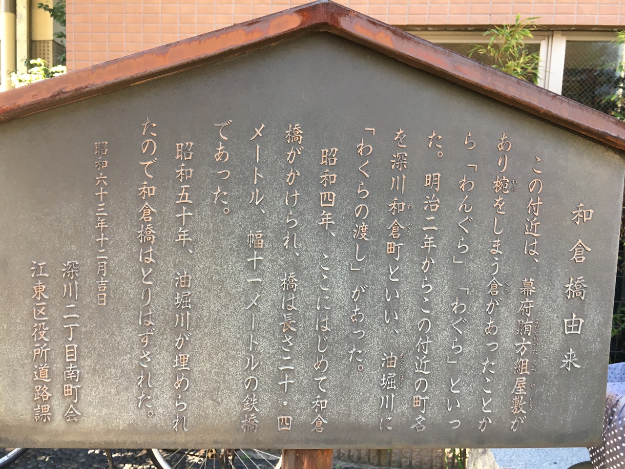 昭和4年に架けられた橋でしたが昭和50年に埋め立てられた橋です。歩いていると橋らしい雰囲気が残っており、30メートル離れたところにも和倉橋の説明看板がありました。現在は道路沿いにあり、上には首都高速道路が走っています。