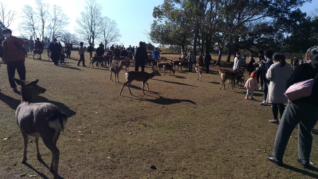 本来は夏のみに開催されているホルンの鹿寄せが2020年に限り週末限定で冬季も開催されていました。奈良市内の観光協会が協賛しているようで、協賛ホテルに宿泊していると記念品も授与されます。思ったより鹿の数が少なく、ヒトの方が多いくらいでしたが、ホルンの音に引き寄せられる鹿の群れを眺めることができました。