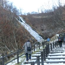 雪の階段を踏ん張って登って滝の景色を楽しむ。