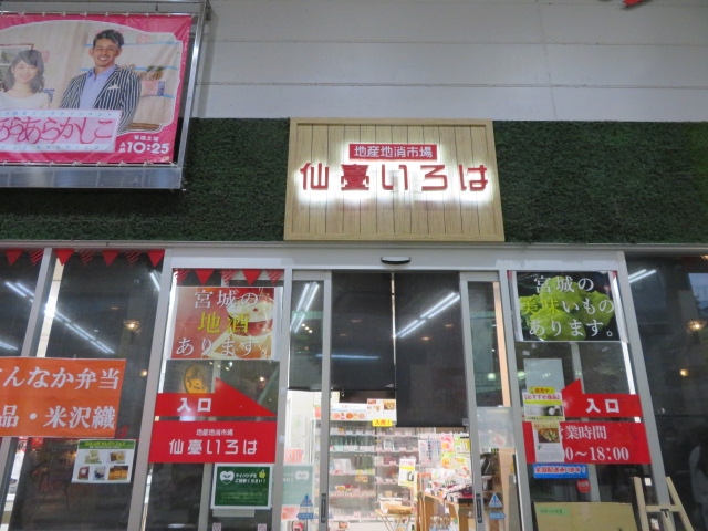 クリスロード内にあるお店です。看板には地産地消市場が小さく書いてあって、大きく「仙壺いろは」と大きく書いてあります。テレビにも紹介された模様です。おみやげ処などに比べて派手さはないですが、地酒や珍しい地元の生産品が置いてあります。