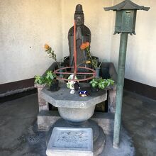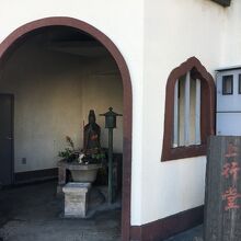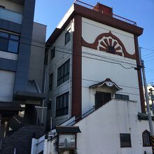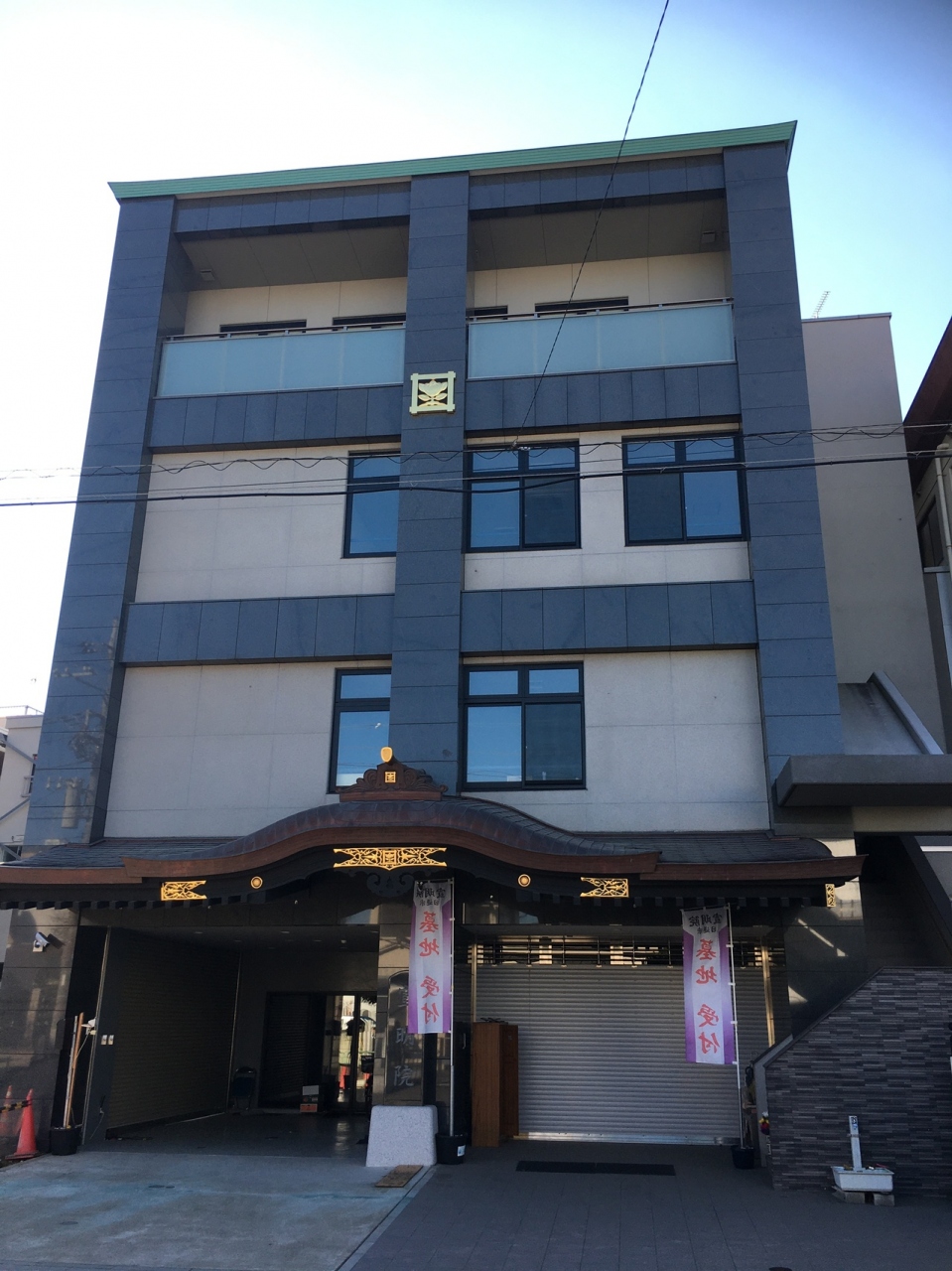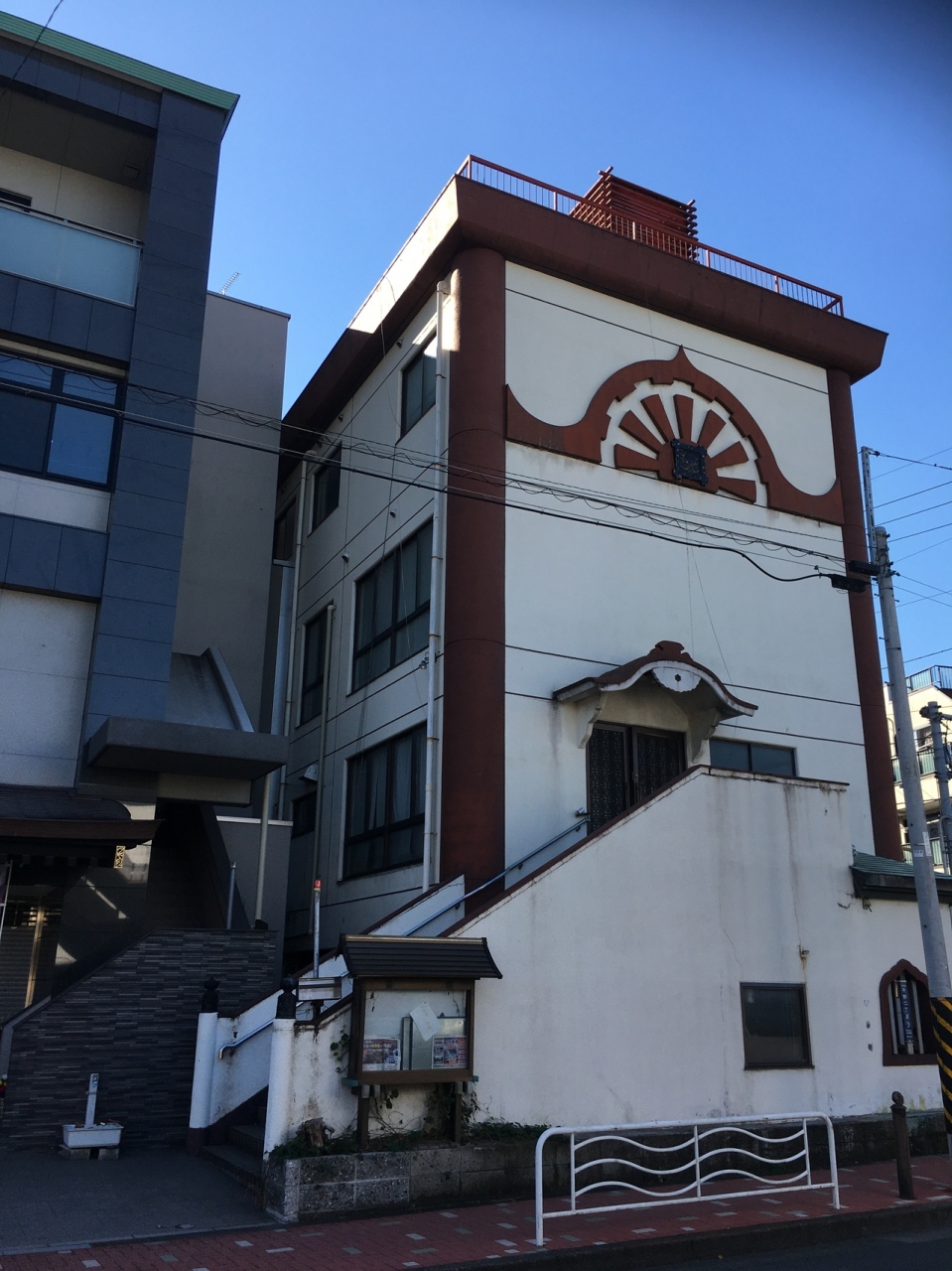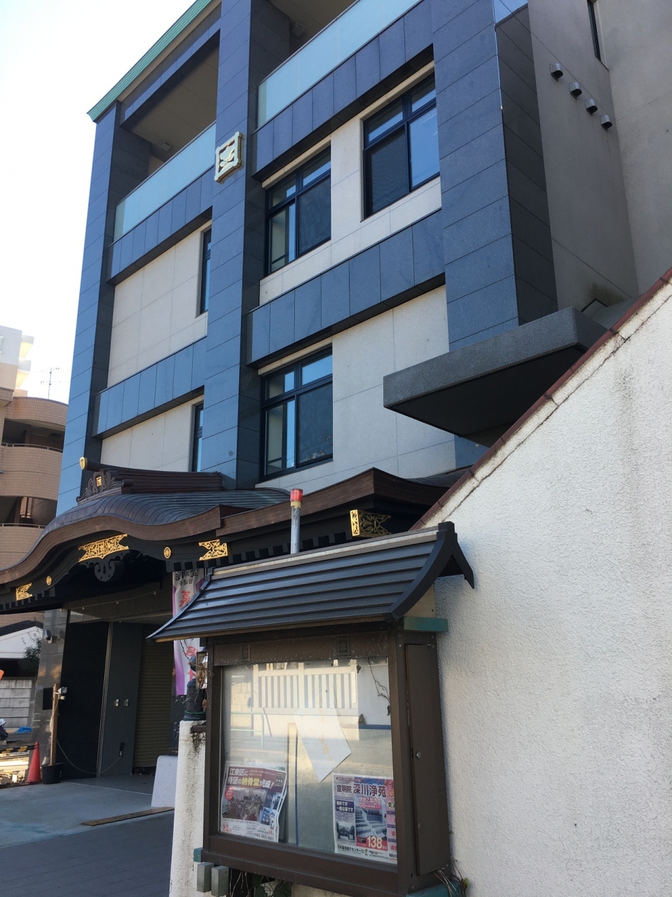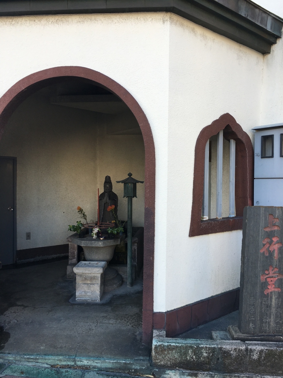 鉄筋の4階の建物が2つあります。1つの建物は新しく1階は駐車場で上部は金色の模様があり目立っていました。交差点角には、上行堂があり、仏様が祀られていました。長身の仏様で手を合わせていましたが小さな仏様です。