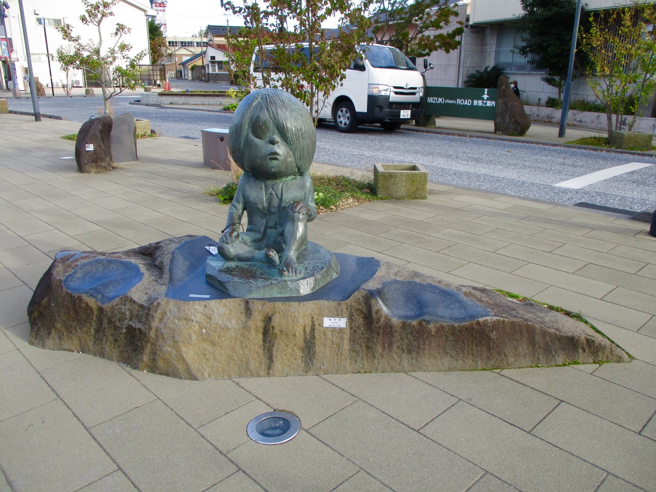 昭和の時代にテレビで馴染みのあるキャラクターが、境港の駅前から水木しげる記念館まで約800メートルにわたる道沿いに点在していて、妖怪のブロンズ像を見て歩くだけでも楽しめた。平日のせいかお土産屋さんはどこも空いていた。