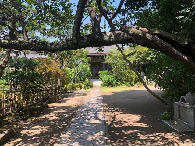 JR鎌倉駅の東口から歩いて7,8分の所にあるお寺で、山号寺号は中座山大聖院教恩寺です。山門の先、本堂との間の参道には、覆いかぶさるようにタブの木が真横に延びており、神秘的な光景です。