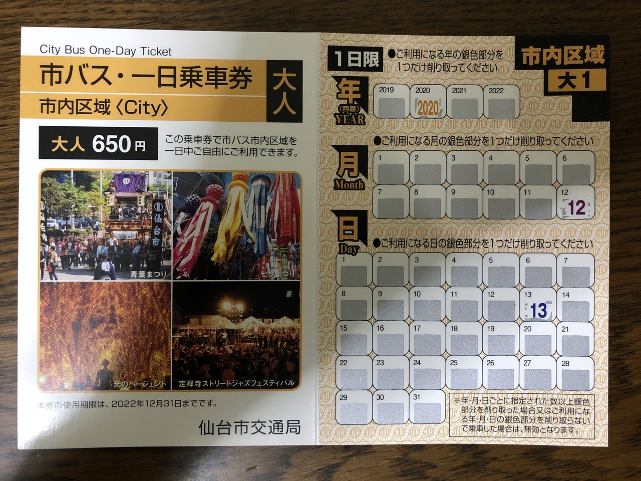宮城交通とともに、仙台市内を走る路線バスです。赤っぽい宮城交通に対して、仙台市バスは青っぽい色です。仙台駅から260円以下の区間、乗り降り自由の、一日乗車券650円があります。また、宮城交通とともに、仙台駅付近の運賃は、120円と安くなっています。