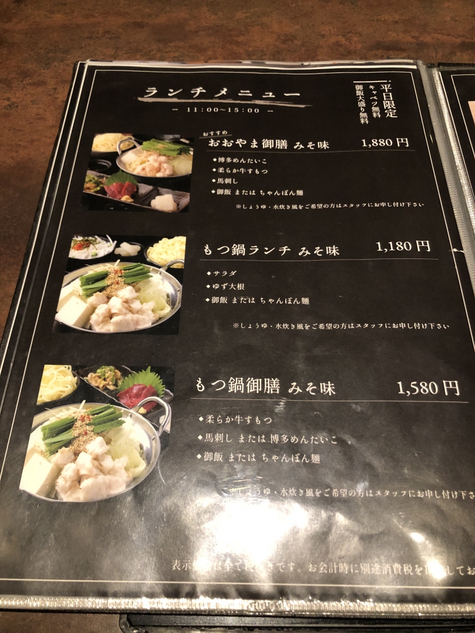 横浜ランドマークタワーの地下1階に入っています。平日のランチで利用しました。もつ鍋御膳(1,580円)を注文。もつ鍋に、スモツや明太子などがセットで付いているものでした。定番はみそ味ですが、しょうゆ味、水炊き風にすることもできます。