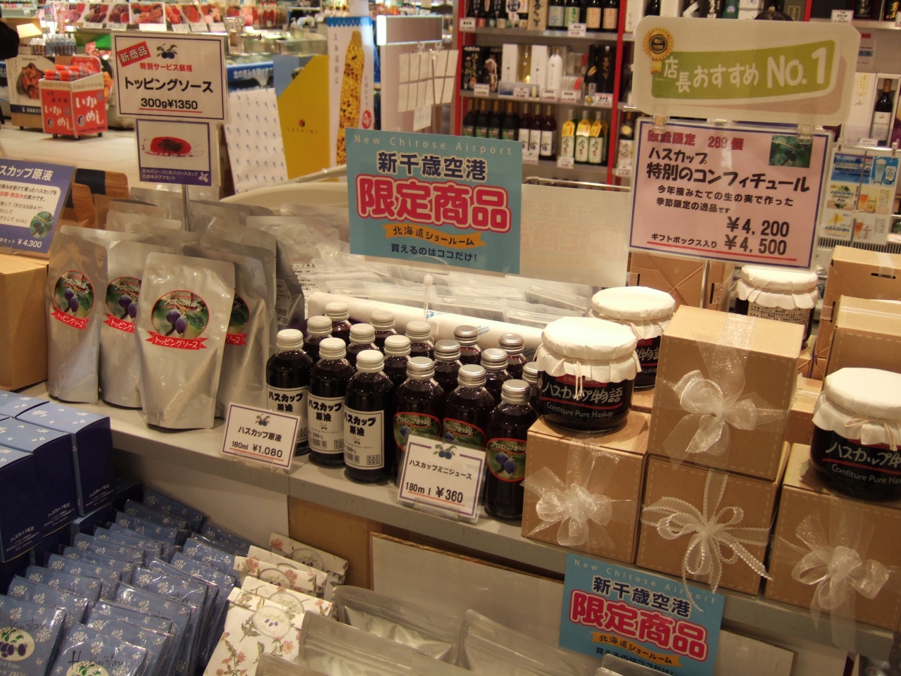 新千歳空港国内線ターミナルビル2階の中央にある、ハスカップの専門店。北海道特産のハスカップはブルーベリーとも違った独特の酸味がクセになりますが、アントシアニンの含有量が多く、目に効きます。ジュースやジャムがそろってますが、北海道ならではのお土産になります。