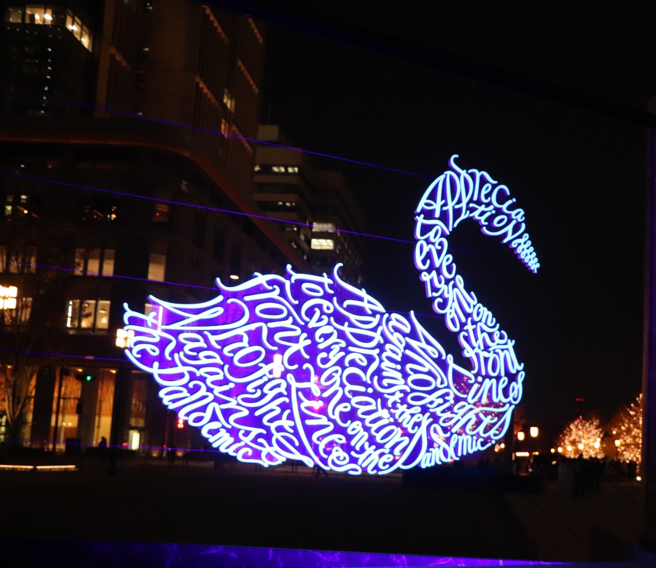 東京駅前の広場では2羽の白鳥が医療関係者への感謝の言葉を表し、行幸通りでは、詩をArt Calligraphyでヌーやフクロウの姿で表現していました。