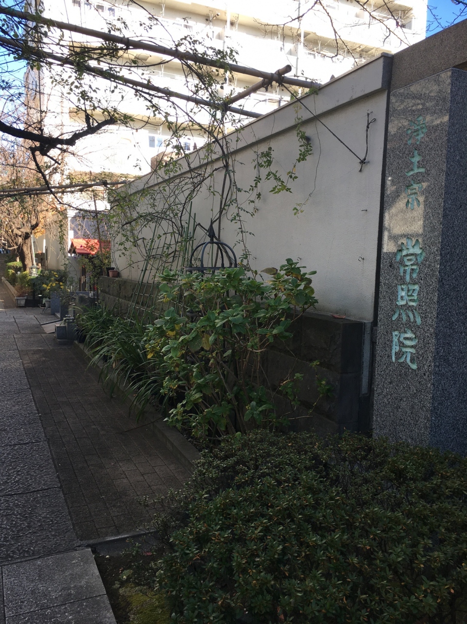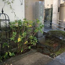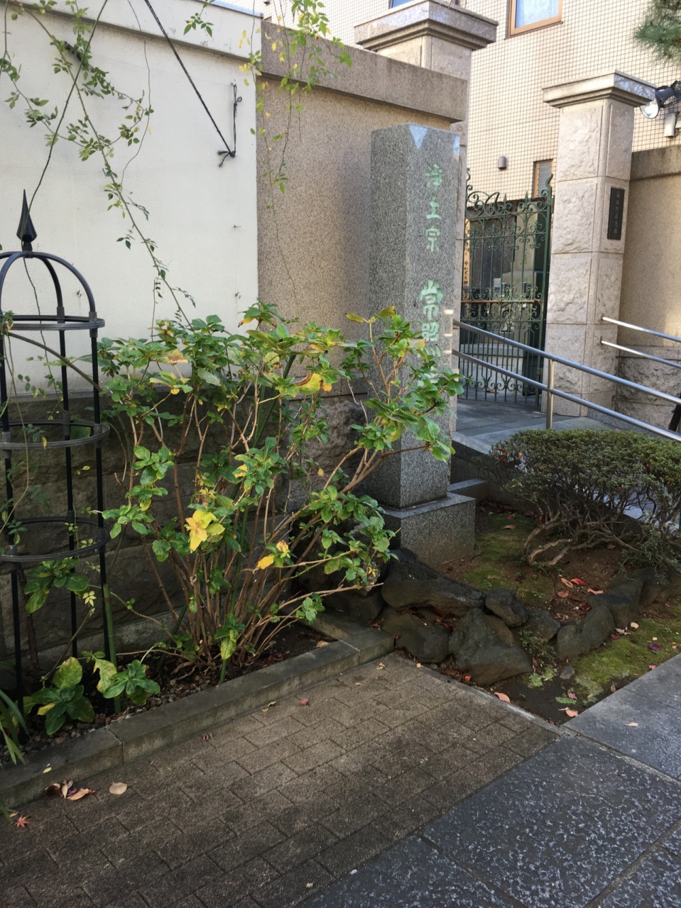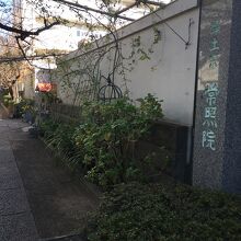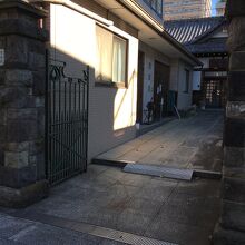 路地裏にあり、お寺がいくつかある地域にありました。門は黒い自宅にあるような門を少し大きくしたような感じで境内は舗装され木々が植えられ、灯籠や石を積み上げたような塔もありました。門の横には掲示板がありました。