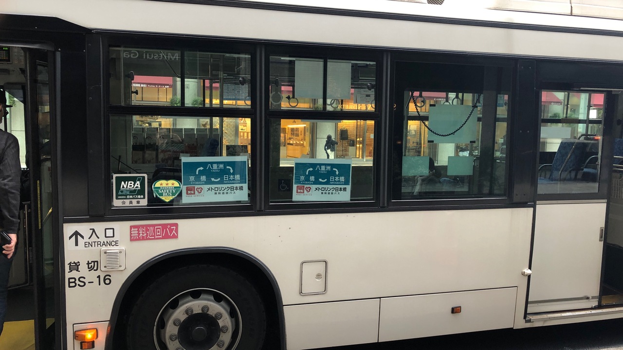 東京駅八重洲口~日本橋駅~三越前駅~京橋駅~東京駅と循環する無料バスです。沿線企業の協賛で無料となっています。10分間隔なので、あまり待たずに乗れます。HPの地図上に、バスの現在位置が表示されるので便利です。東京駅の乗り場は、八重洲北口のさらに北、鉄鋼ビル前なので、駅から少し離れています。