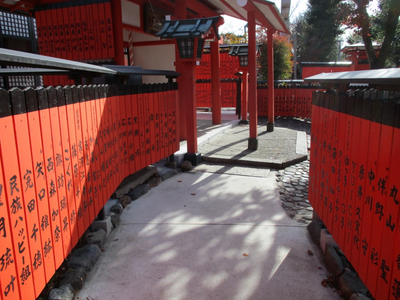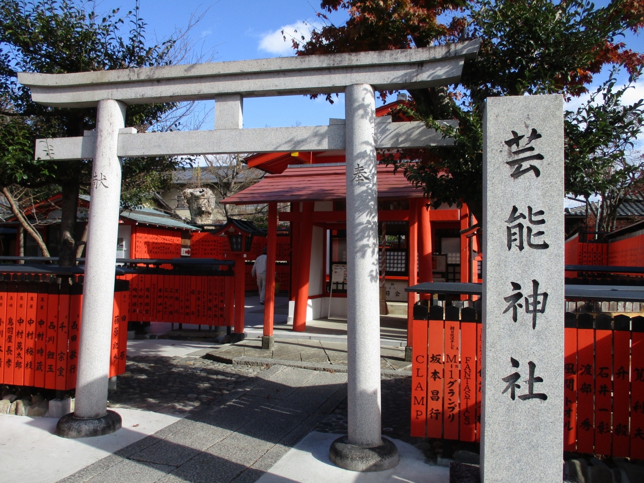 車折神社の末社の芸能神社。こちらのほうがお目当ての方も多いのではと思います。あらゆるジャンルの芸能人の方の玉垣がびっしり並んでいて迷路のようにも見えました。あの人もこの人もというかんじで、見て歩くのが楽しかったです。