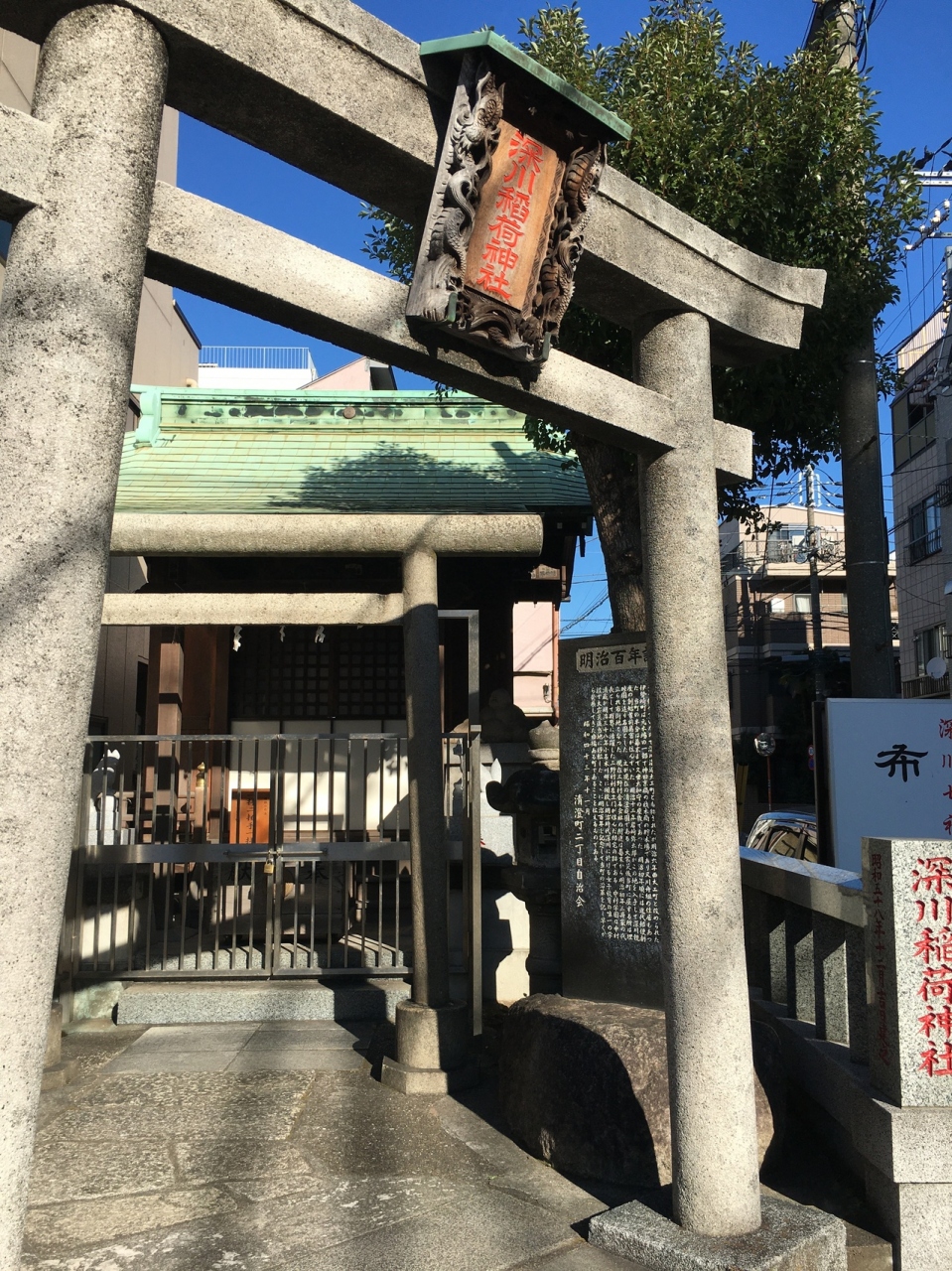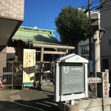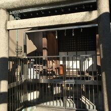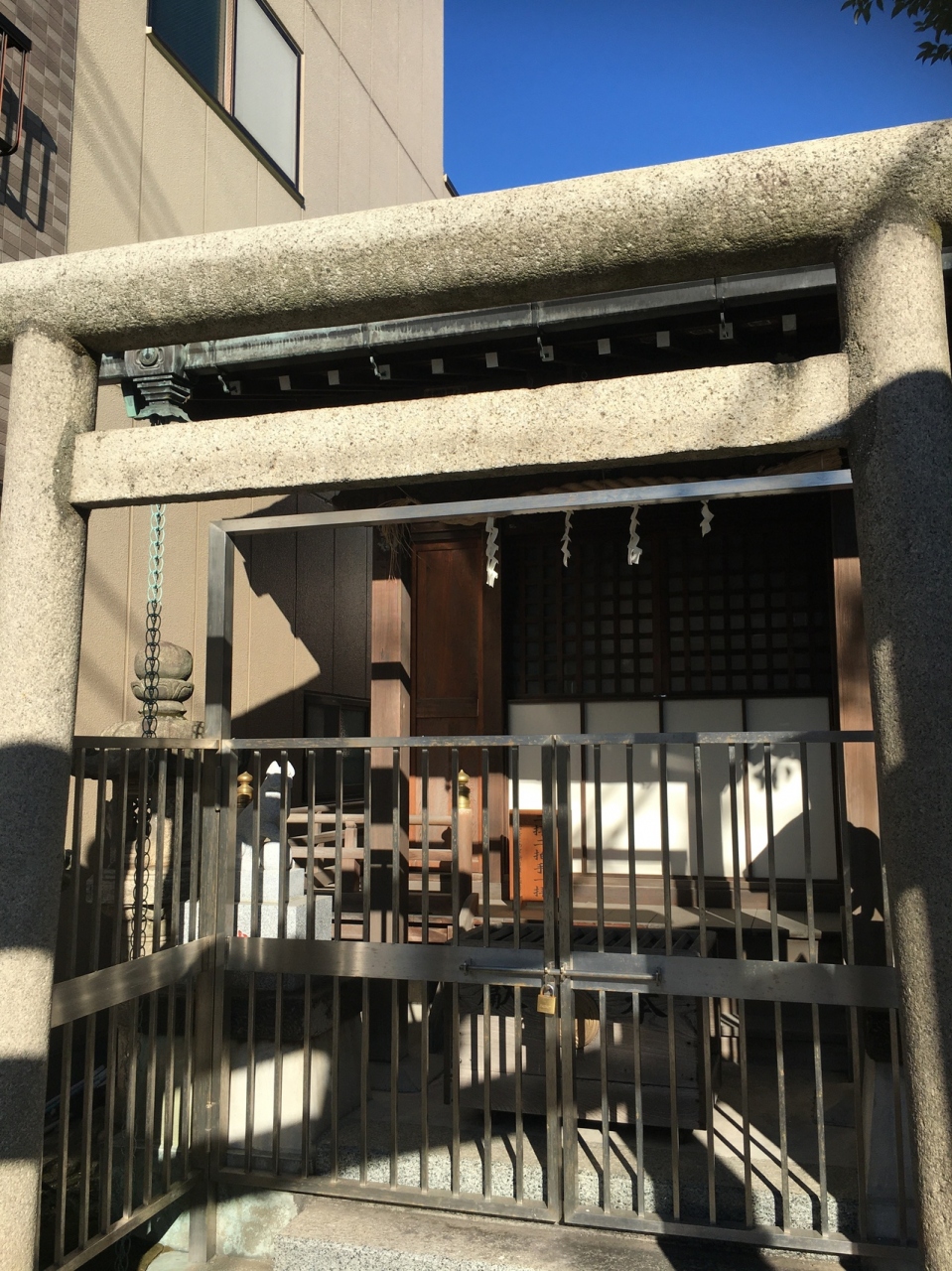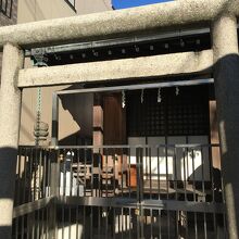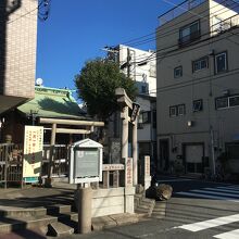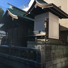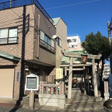 住宅街にあり、交差点の角にある狭い境内でした。鳥居が2つあり、鳥居間は僅か1メートルもない距離で、その後ろが本堂で前には門があり鍵が掛けてありました。横には古い灯籠があり、社務所もあります。囲ってある石には赤字で人の名前の記載があります。