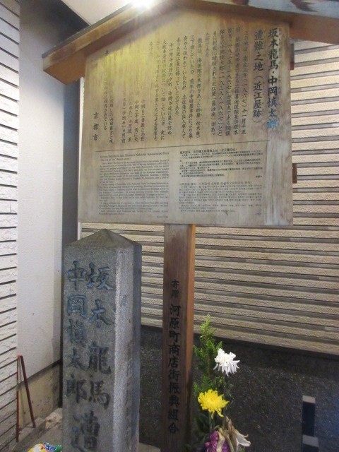 京都の町中に急に現れる場所です。石碑とともに案内板と、坂本龍馬と中岡慎太郎の絵などが展示されているので、わかりやすいですが、唐突に商店街に現れるのでちょっと不思議です。幕末の近江屋事件のあった場所で、ここで竜馬は暗殺されてしまいます。場所柄しみじみしにくいですが、重要スポットですね。