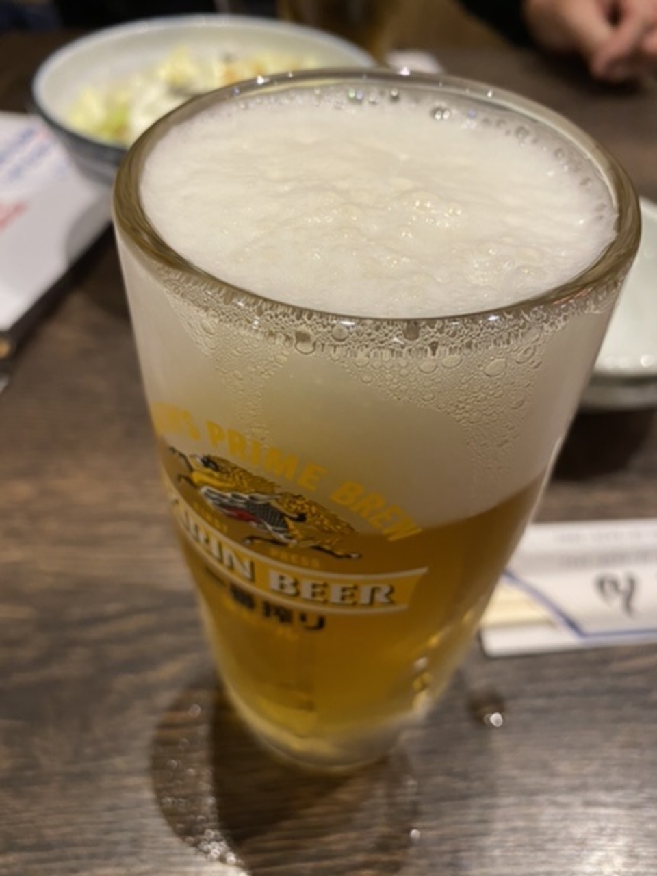 焼き餃子を生ビールで!焼き餃子は海老餃子ですね。