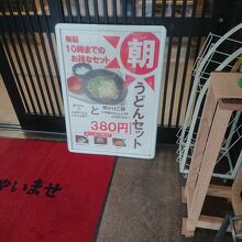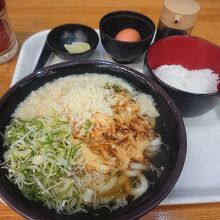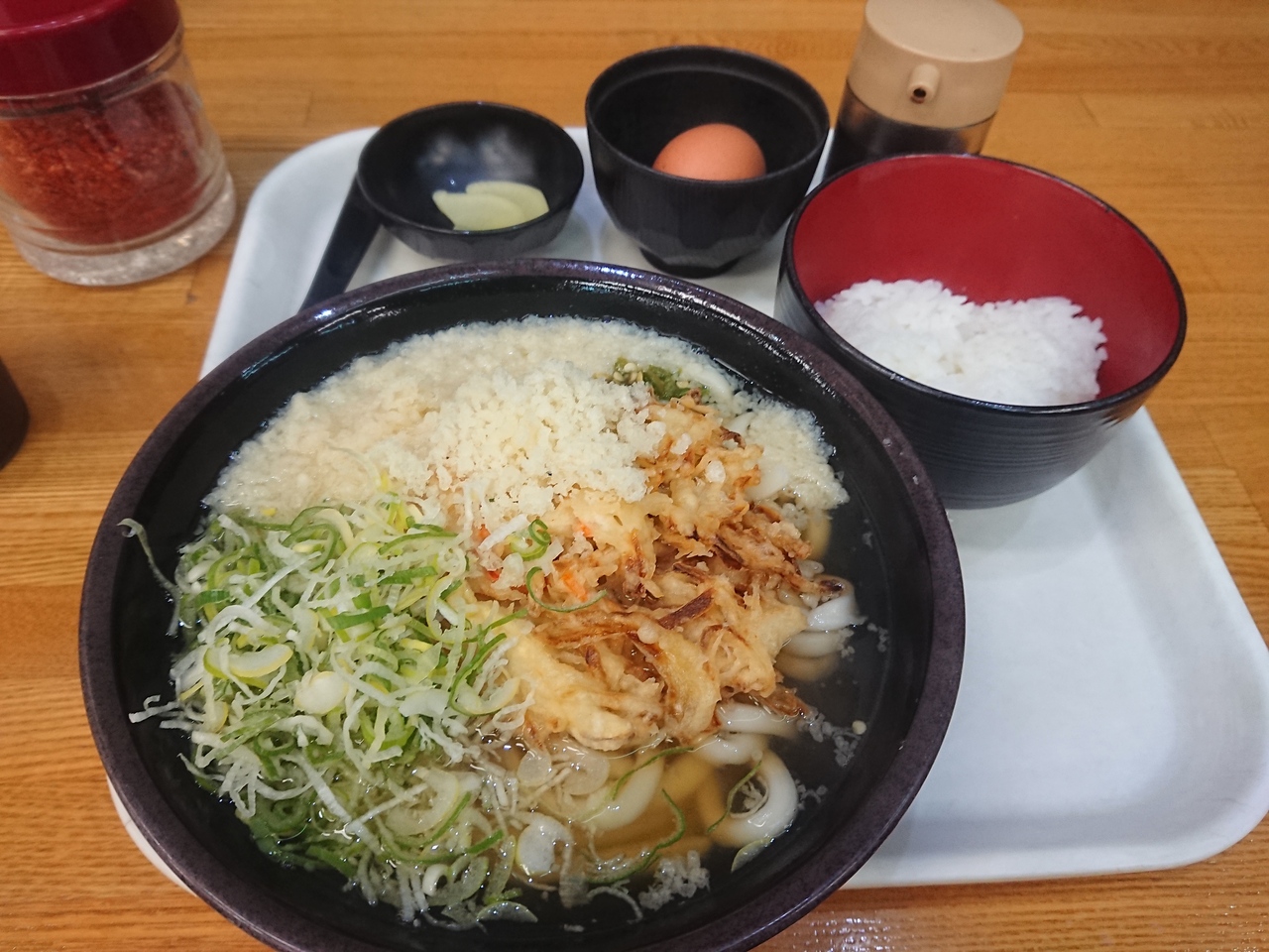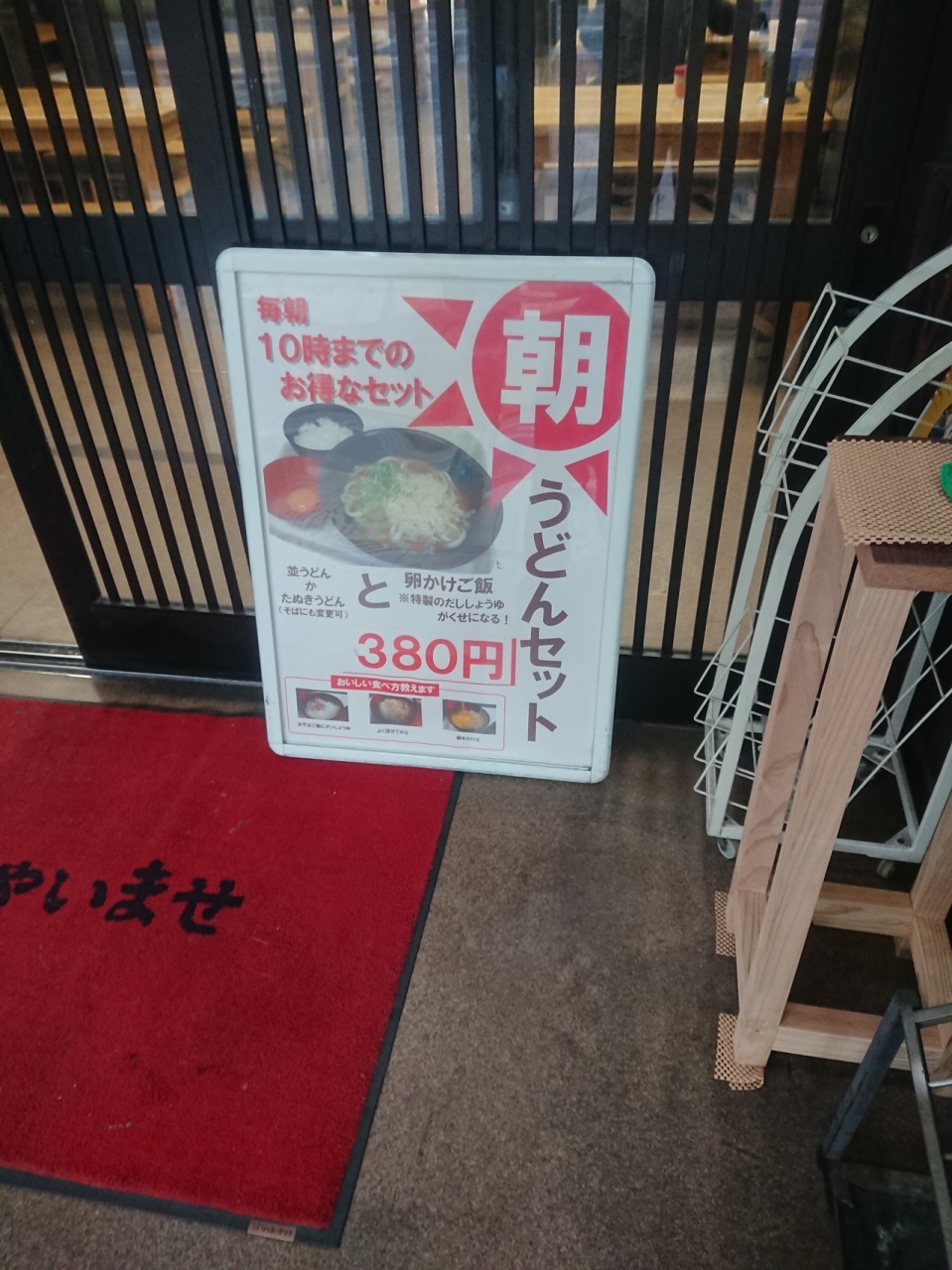 宮崎の橘通りを歩いてたら、早朝6時から営業の案内表示を見かけ、朝食のために利用しました。朝メニューでうどんと卵かけうどんがセットになった朝うどんの看板が入口でアピールしていたので、オーダーしてみました。380円というリーズナブルな価格です。これでは寂しいかと思い、野菜のかき揚げをプラスして500円ジャストです。