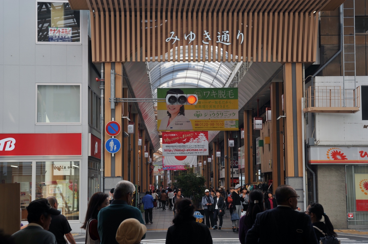 JR姫路駅から姫路城方面へ向かうアーケード商店街だ。二通りの商店街が平行しているが、みゆき通りはその広い方だ。本当に久しぶりに行ったが、アーケードが新調され、明るいイメージになっていた。地方商店街としては珍しく、空き店舗は少ない方だ。