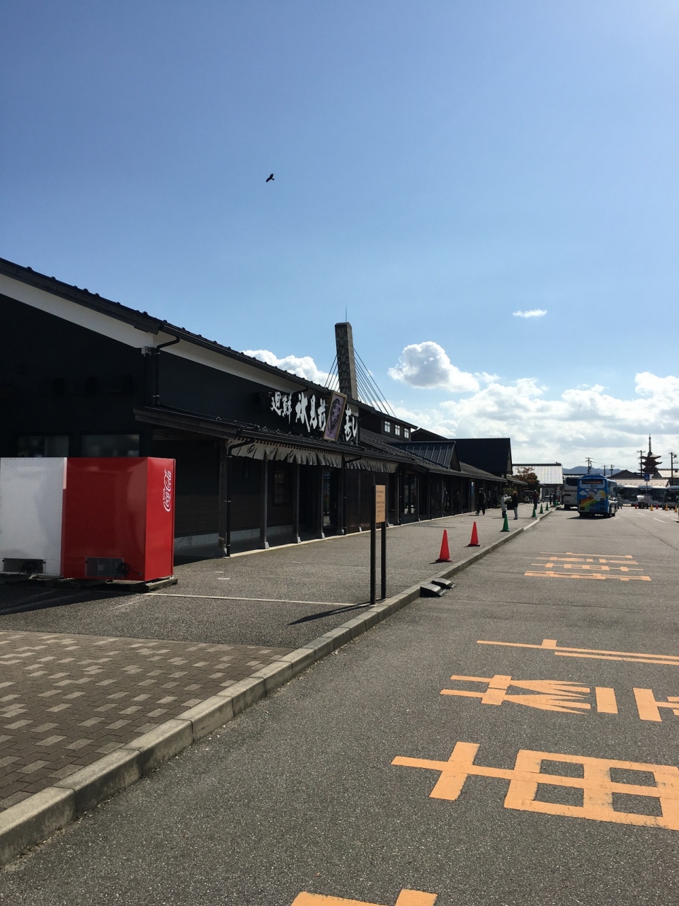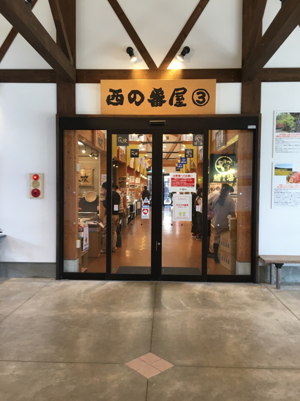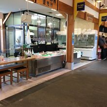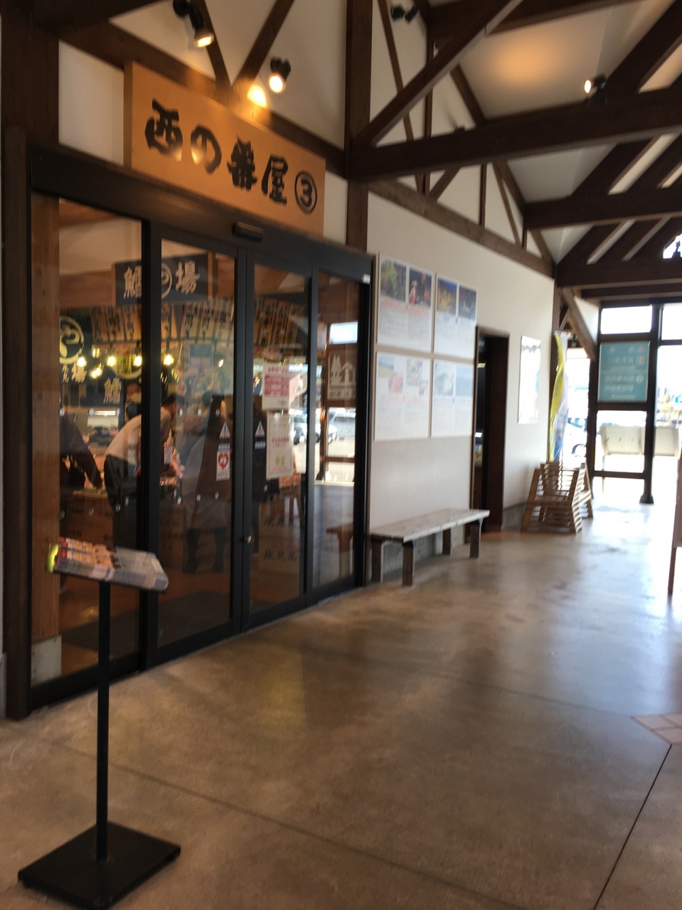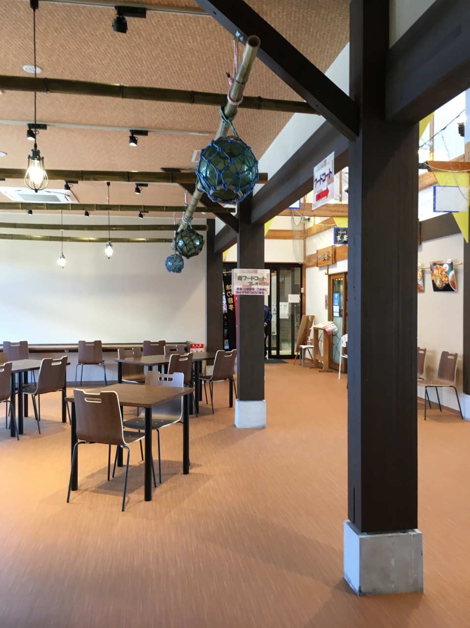30数店舗の店がひしめき合い、飲食コーナーと物販コーナーに分かれていました。店内の通路は狭かったです。建物の前は公園になっていて観光バスも多いので駐車場も広く、展望広場からは海も見ることが出来ます。足湯も隣接です。