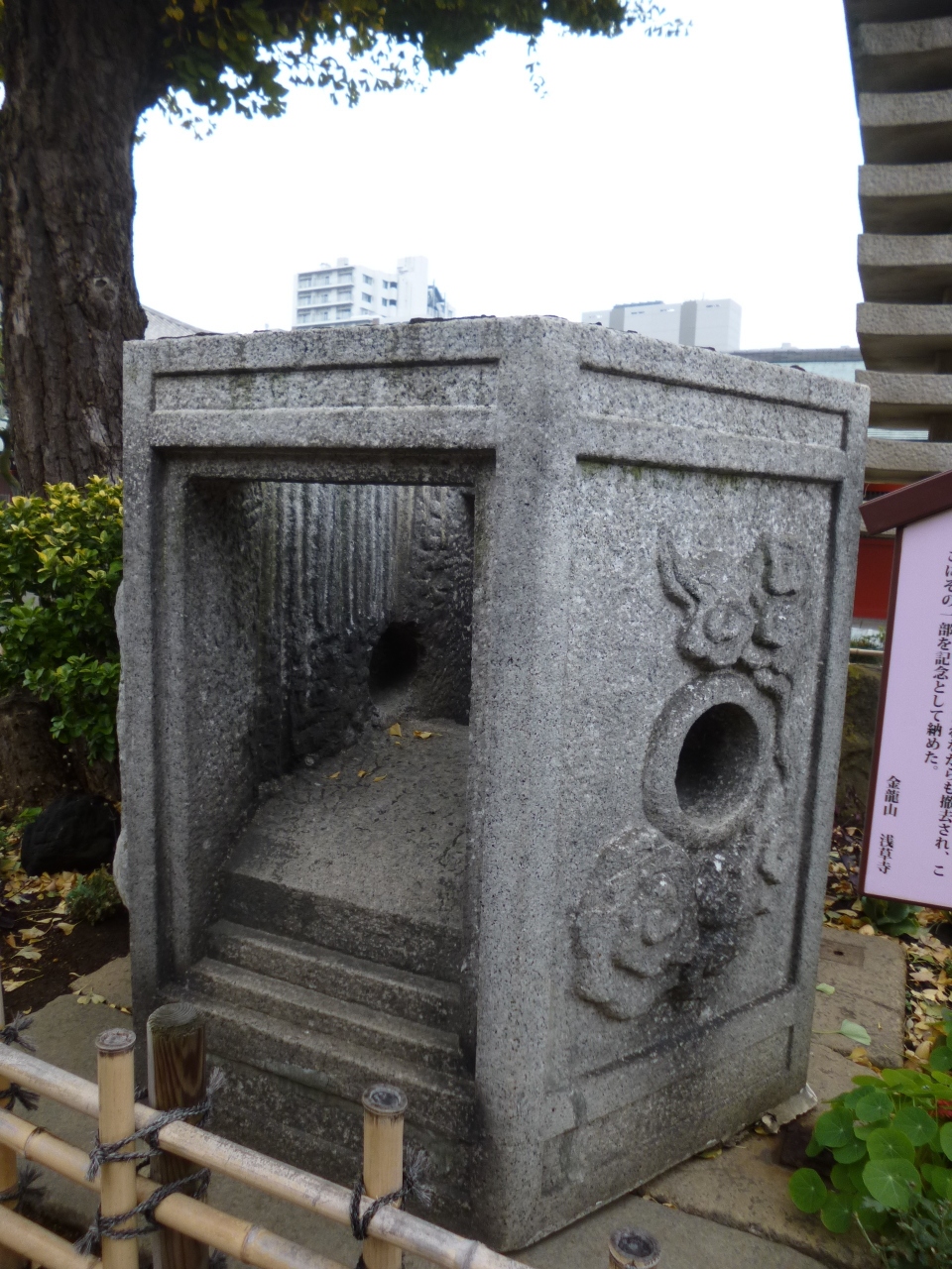 浅草寺の宝蔵門と五重塔の間に碑がいくつか立っている場所があります。その中にこの旧石灯籠籠がありました。15年ほど前まで、本堂の前に立っていた5メートルほどあった石灯籠の一部だそうです。明治25年に奉納されたものだそうですが、倒壊の恐れのため撤去されたそうです。当時の石工の仕事を間近に見ることができます。