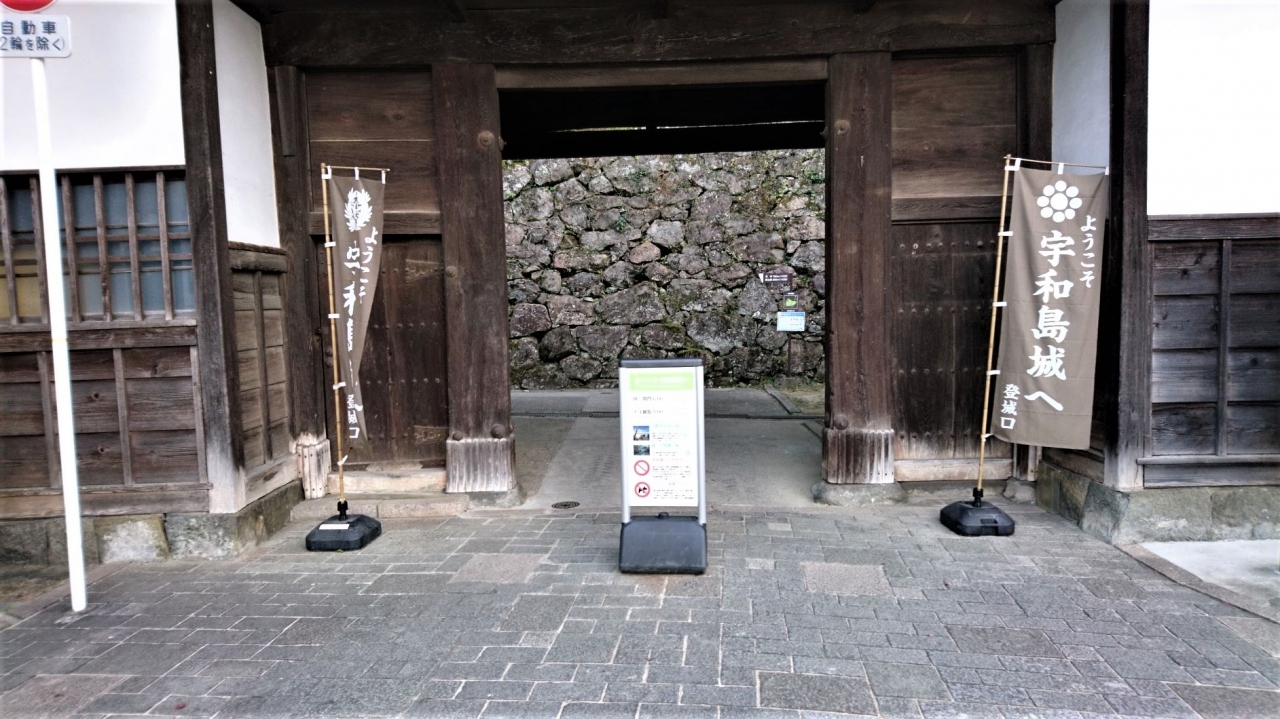 宇和島城の城内に入場する際に通る市街地(繁華街)側の入口に建つ門。市営の駐車場(有料)がその前にあるが今回行った際は工事中。ここから城内への道は急な石段と比較的なだらかなコンクリート坂道があり、石段は健脚でないと苦しい。